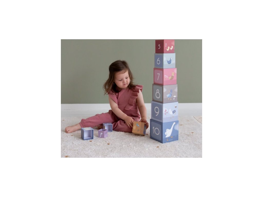 S těmito úžasnými bloky se děti učí hravým způsobem počítat od 1 do 10. Kostky zdobí náš Husa a jeho přátelé, kteří žijí kolem rybníka na venkově. Buď je stohujte svisle, abyste vytvořili vysokou věž, nebo je uspořádejte vodorovně do řady, abyste se dozvěděli o velikostech.