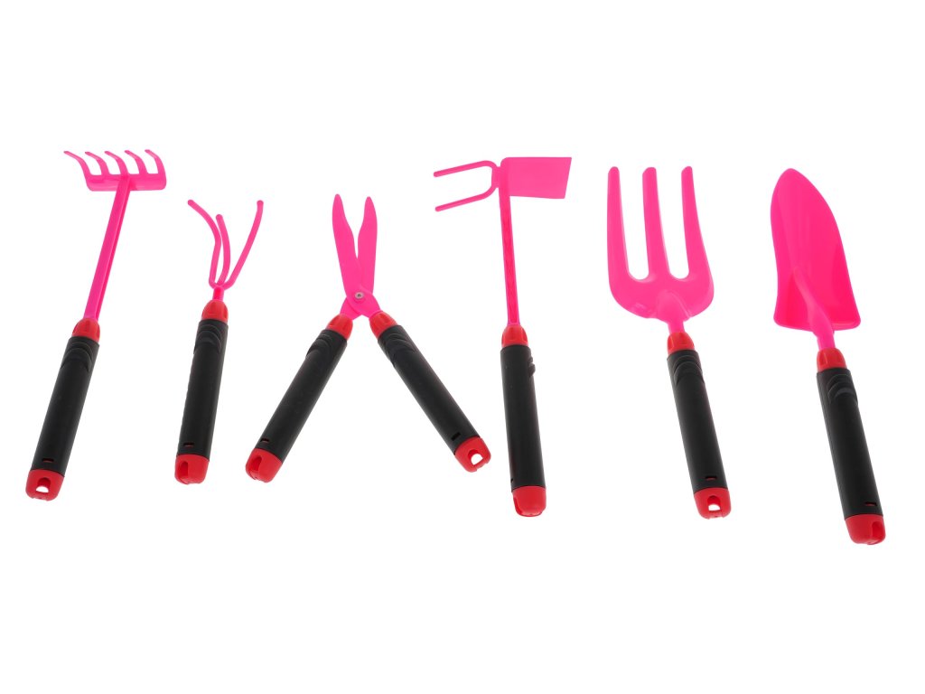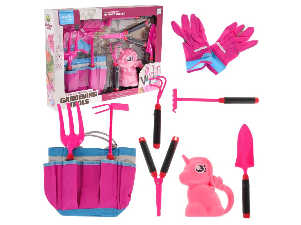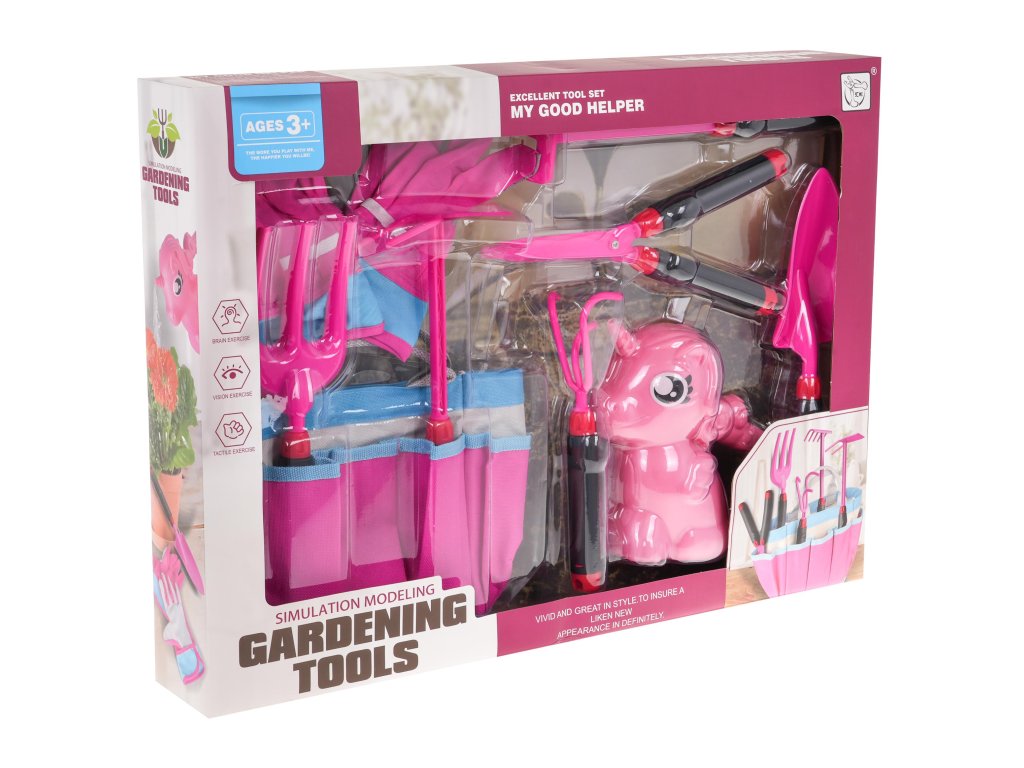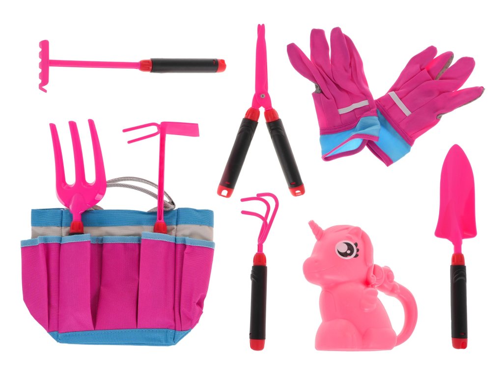 - tool bag, -Gloves - a watering can in the shape of a unicorn, -scissors -Forks -trowel - manual cultivator, - rakes, -hoe |