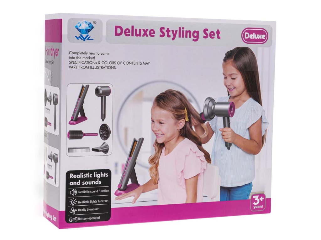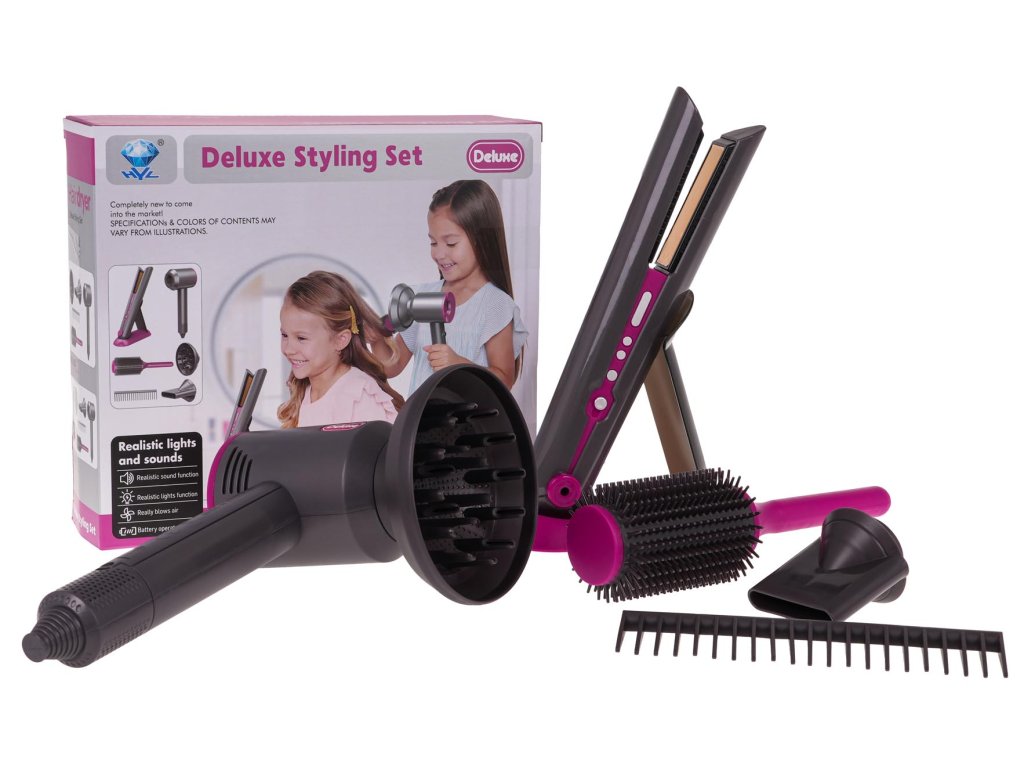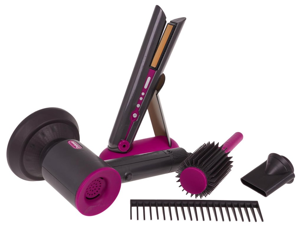 - suitable for children from 3 years of age, - made with attention to detail, - faithful copy of the original, - the dryer has replaceable tips: a diffuser and a focusing attachment, - the dryer has sound effects in the form of a drying sound, - the dryer has a gentle air flow, - the straightener produces noises typical of this device, - the straightener plates are decorated with lights. |