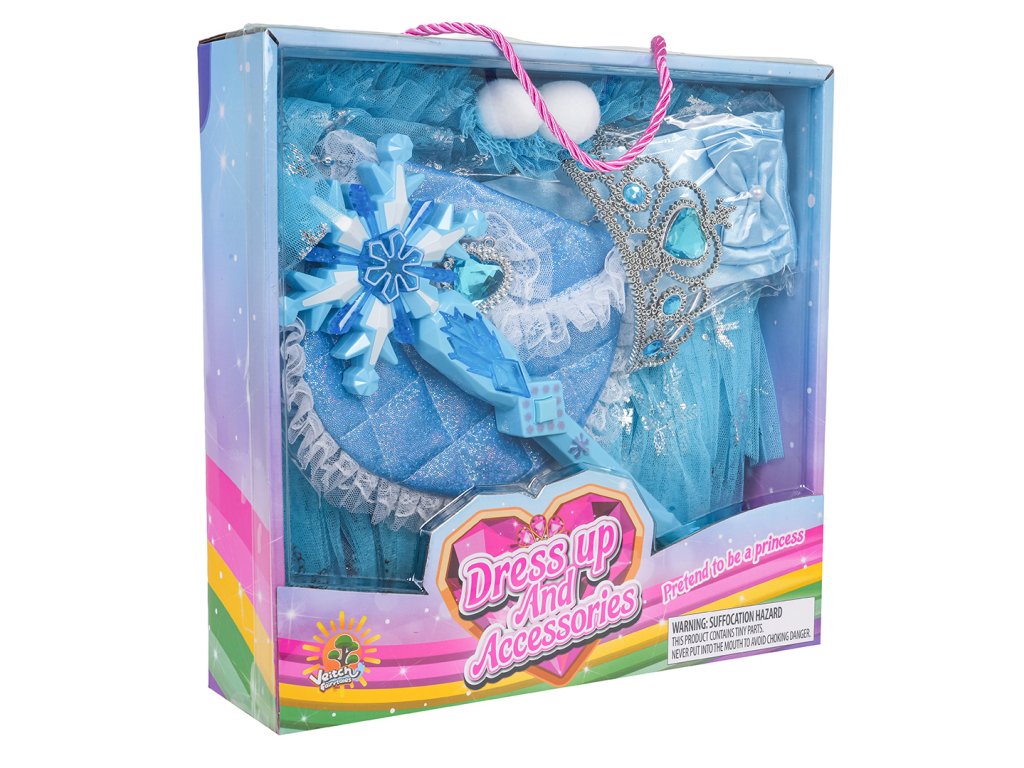 This little princess set is perfect for children aged three and up. The set is meticulously crafted in a beautiful sapphire blue and embellished with blue stones. The set includes a tulle cape, gloves, a handbag, a crown, and a magic wand with sound and light effects. It's perfect for a ball, a performance, or everyday play. The magic wand is powered by 2 x 1.5V AAA batteries (not included).