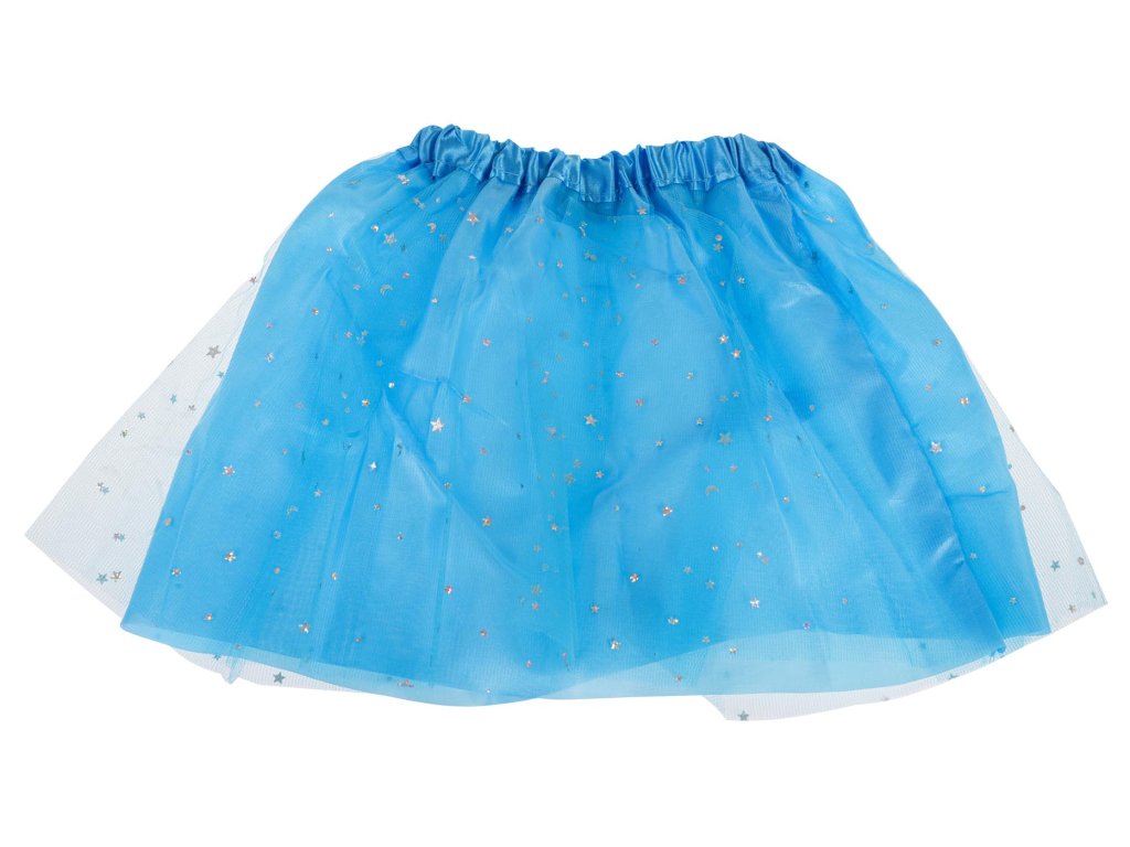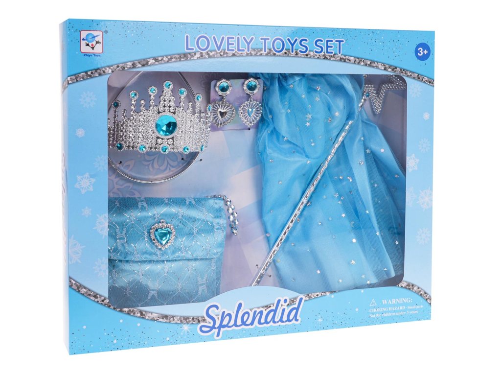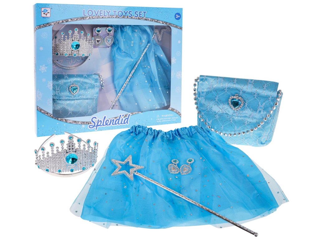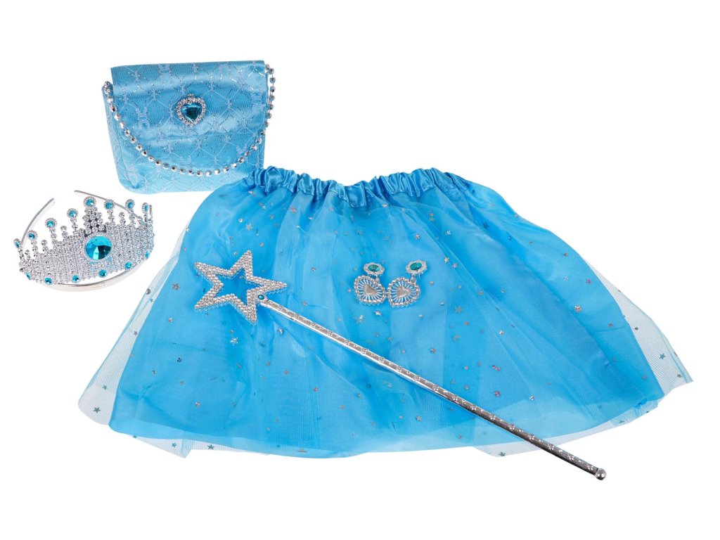 A great set, a costume for a little princess from 3 years of age. The set includes a tiara, a magic wand, earrings, a purse and a skirt. The set was made with attention to detail in a beautiful blue color.