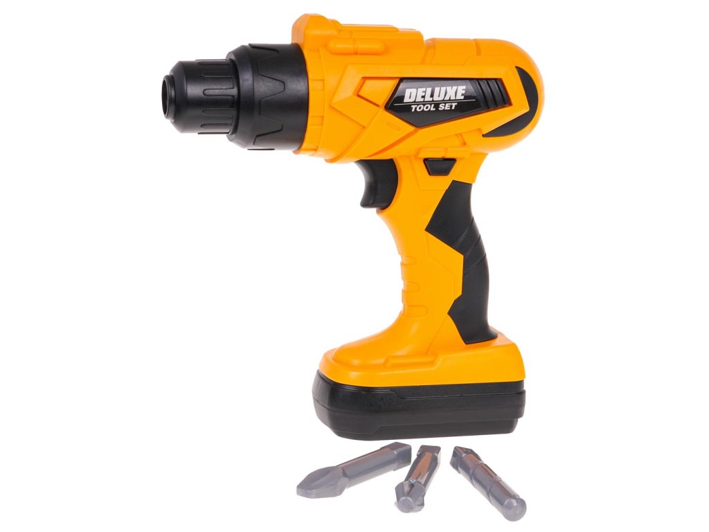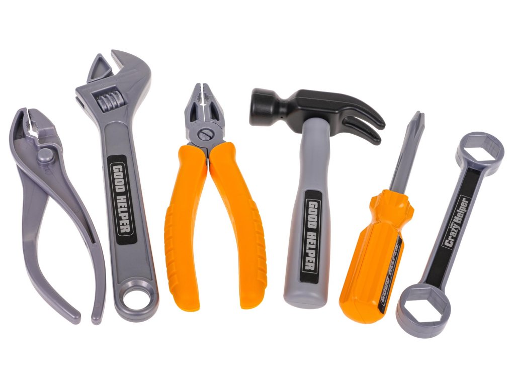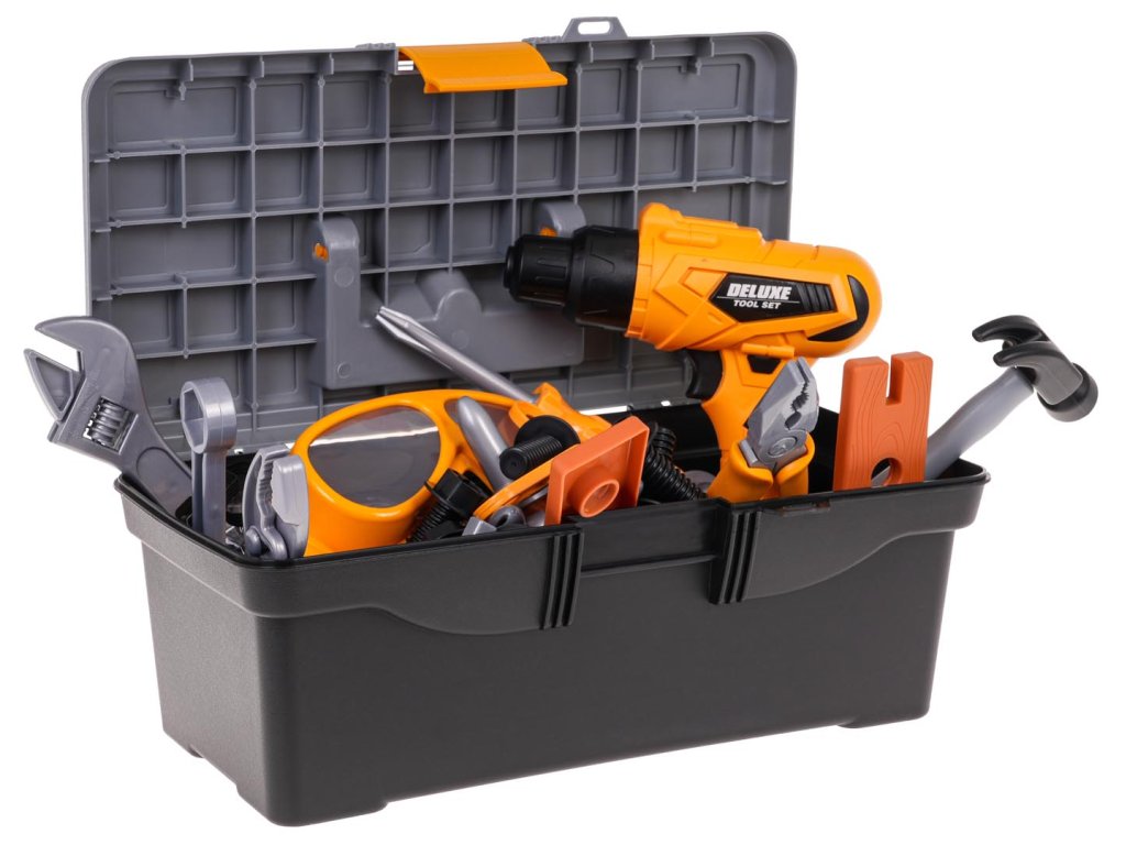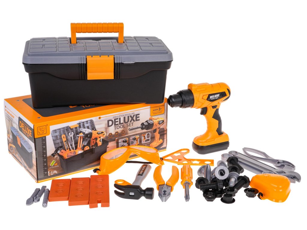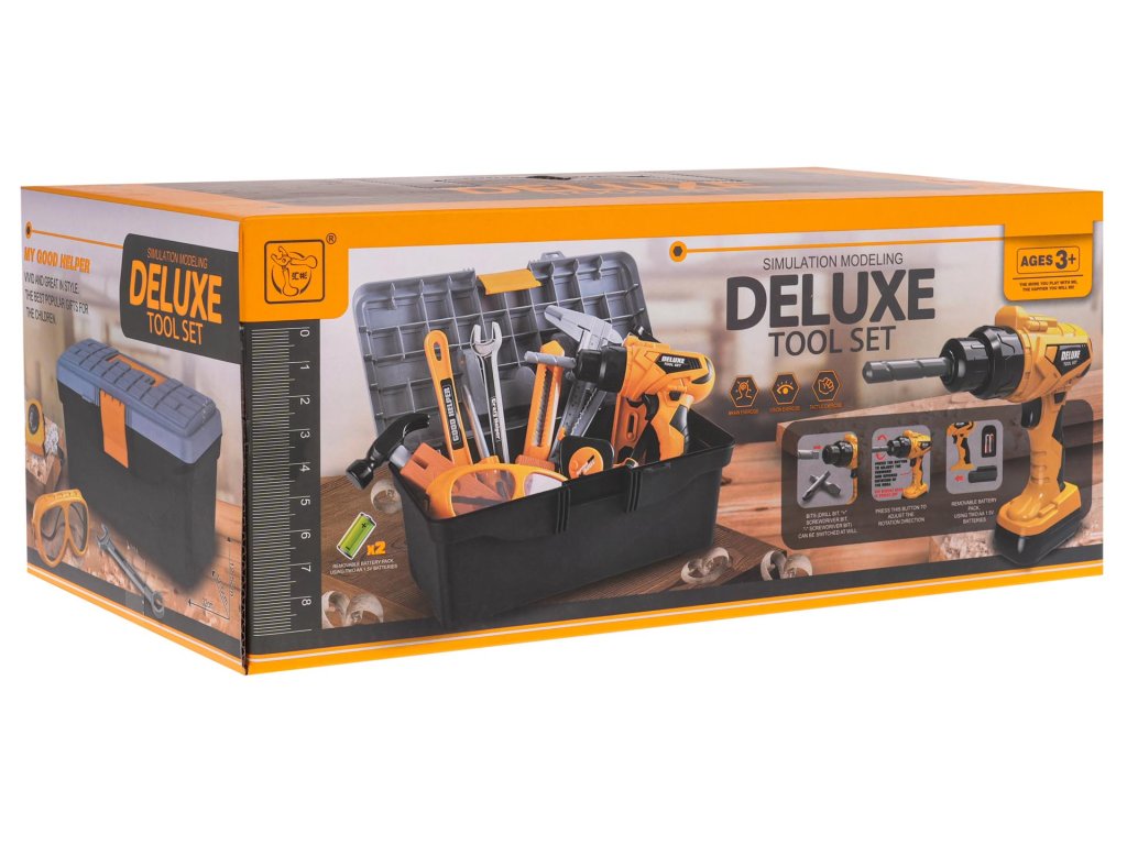 A richly equipped tool set with an interactive drill-driver and a toolbox for children over 3 years of age. The set is made of the best quality plastic and has as many as 37 elements. In addition to a large, professional-looking toolbox, the set also includes: an interactive drill-driver with replaceable bits, safety glasses, a mask, a screwdriver, a hammer, a French wrench, pliers, pincers, and many screws, attachments, and wood for screwing. The drill-driver is powered by 2 x AA 1.5 V batteries (not included). It screws and unscrews, has replaceable bits, and a removable battery.