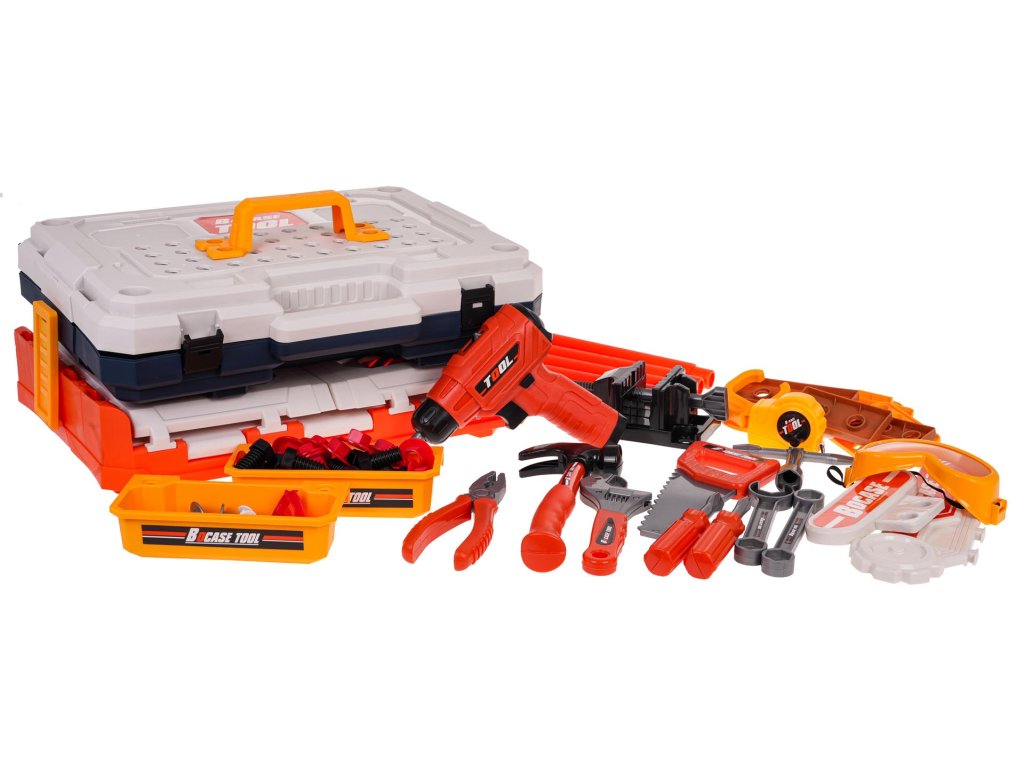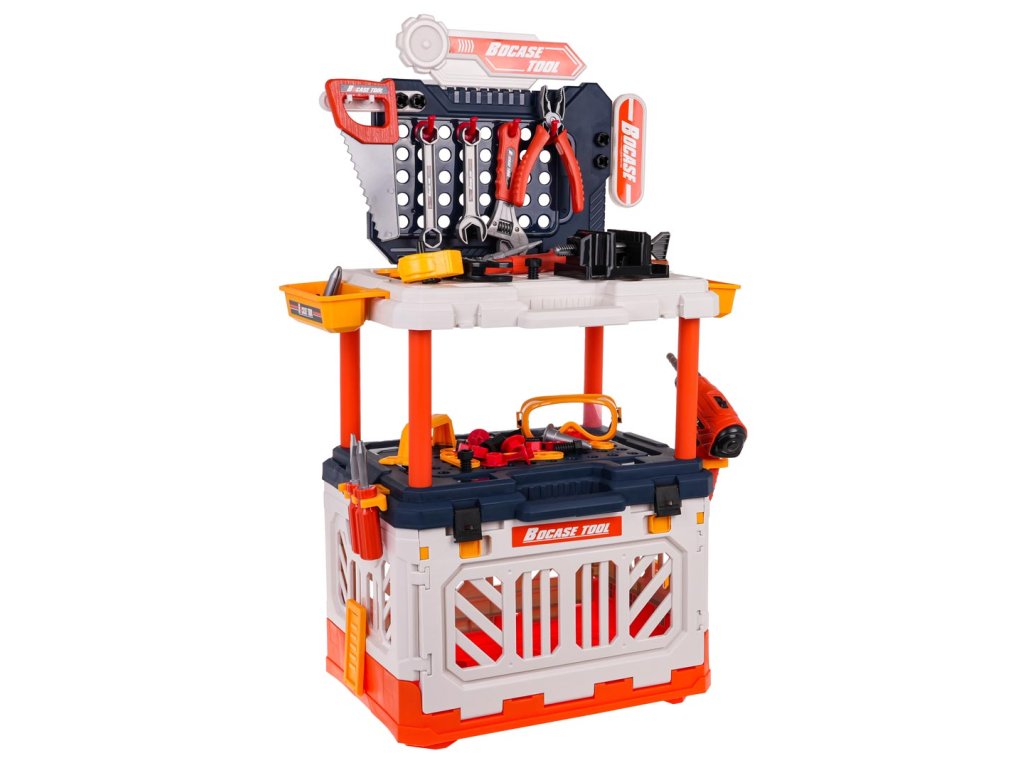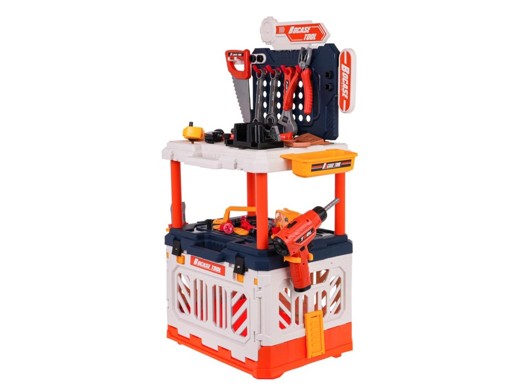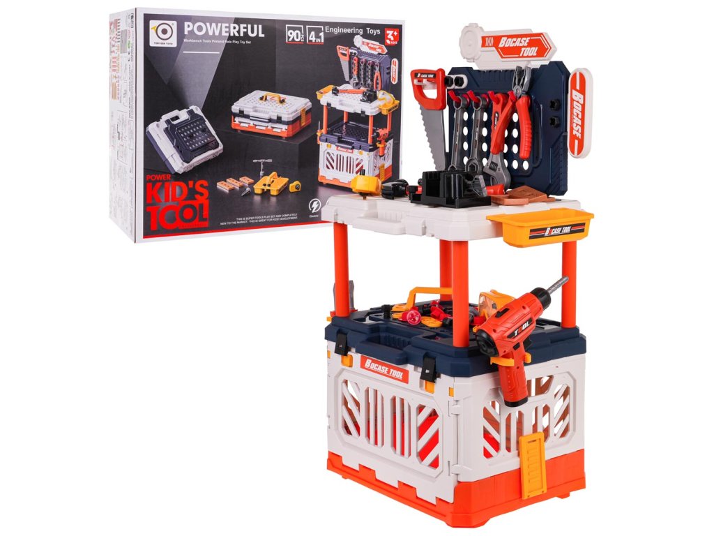- intended for children from 3 years of age, - made of the best quality plastic, - a richly equipped set, up to 90 elements, - battery-powered drill/driver, screws and unscrews, has replaceable bits and lighting, - manually movable vice, - possibility of building up to 4 positions: tool box, portable suitcase, workbench, small workbench. |
