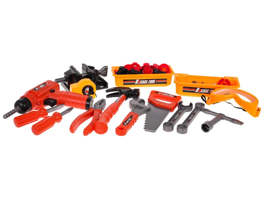 - large workshop approx. 80 cm x 54 cm x 33 cm, - tool box approx. 40 cm x 18 cm x 30 cm, - portable suitcase approx. 40 cm x 10 cm x 30 cm, - small workbench approx. 60 cm x 54 cm x 31 cm, - drill-driver approx. 15 cm x 16 cm x 5 cm, - replaceable drill bits approx. 6.5 cm long, - meter approx. 7 cm x 5 cm x 4.5 cm, - saw approx. 19.5 cm x 9 cm x 1.5 cm, - box wrench and open-end wrench approx. 14 cm x 3 cm x 1.5 cm, - pliers approx. 16 cm x 5.5 cm x 1.5 cm, - wrench approx. 17.5 cm x 6 cm x 1.5 cm, - hammer approx. 21.5 cm x 9 cm x 3 cm, - vice approx. 14 cm x 8 cm x 6 cm, - socket wrench approx. 11 cm x 8.5 cm x 2 cm, - screwdriver attachment approx. 8 cm x 3 cm, - safety glasses approx. 13.3 cm x 6 cm x 4 cm, - expansion bolts approx. 6 cm x 3 cm, - overlay approx. 3 cm in diameter, - screw approx. 3.5 cm x 2 cm, - packaging approx. 43 cm x 32.3 cm x 18.5 cm.