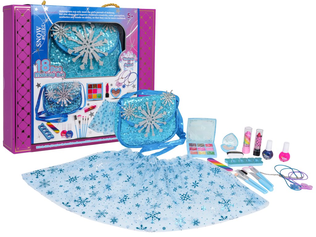 A richly equipped, colorful little princess set, complete with a skirt, handbag, and makeup for children aged five and up. The set consists of 18 pieces, crafted with meticulous attention to detail and using the highest quality materials. The cosmetics are child-safe, hypoallergenic, and easy to remove. The set includes an eyeshadow palette, nail polishes, lipsticks, makeup brushes, a beautiful handbag, necklaces, and a tulle skirt.