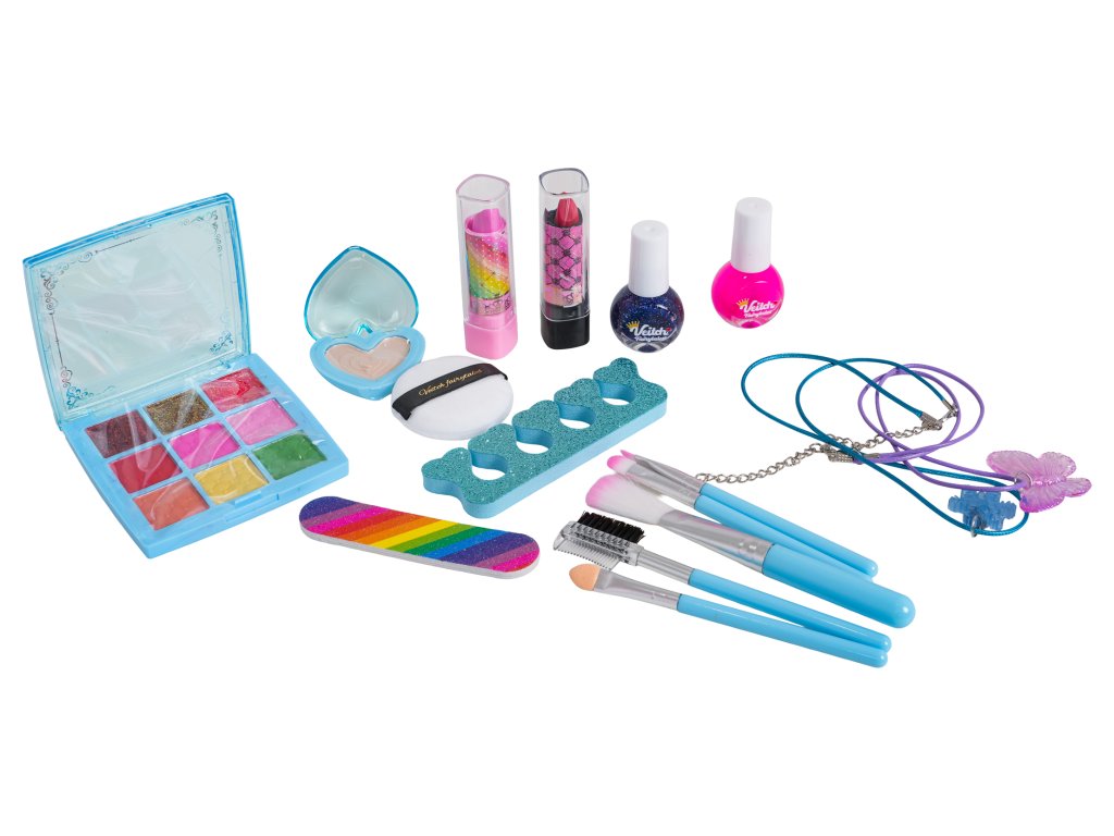 - tulle skirt, - decorative bag, - 2 x necklace, - a palette with six eyeshadows and three glitter lip glosses, - eyeshadow in a heart-shaped box, - 2 x lipstick, - 2 x nail polish, - 4 x makeup brushes and an eyebrow and eyelash brush, - makeup removal sponge, - finger separator, - nail file, - makeup removal sponge, - decorative packaging. |