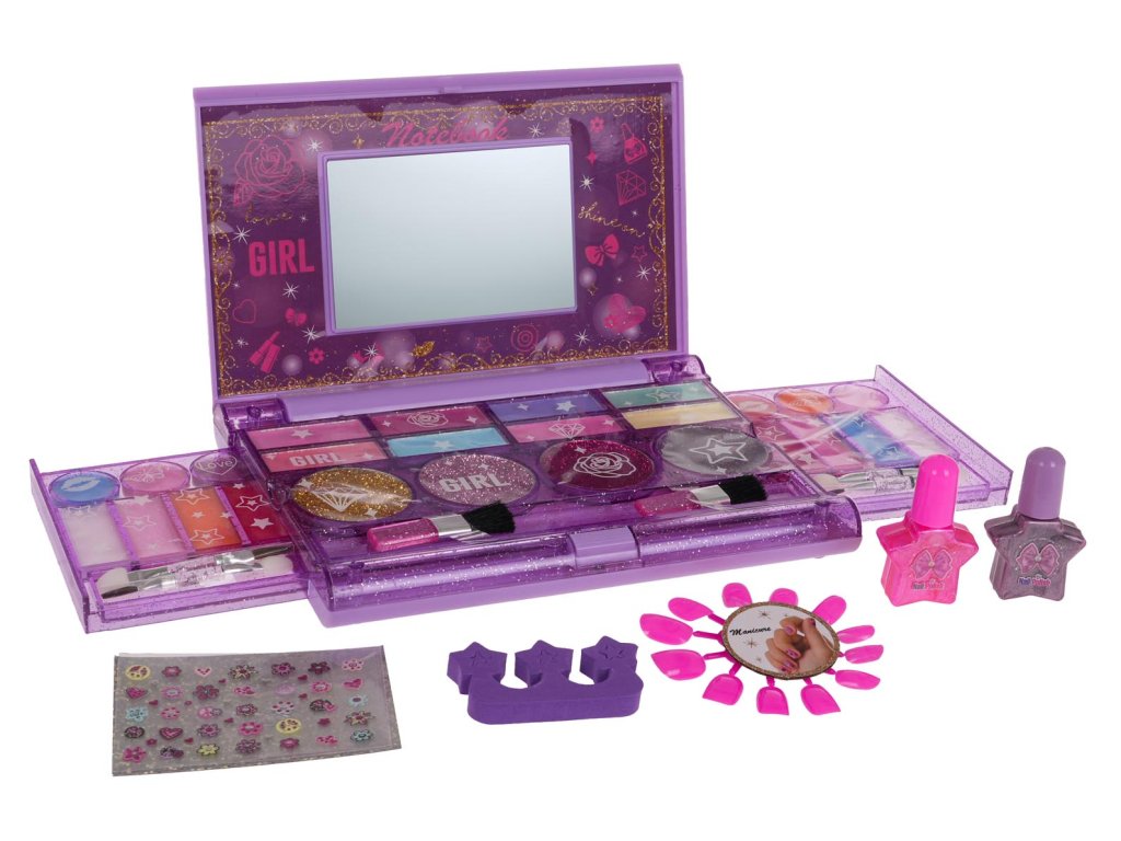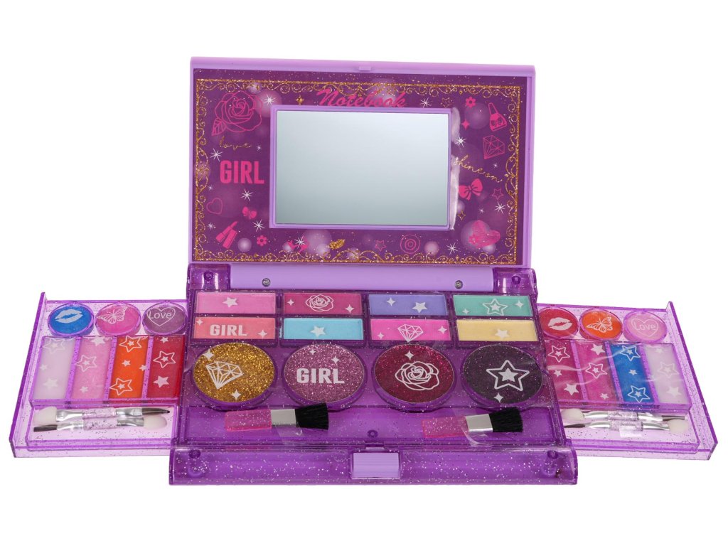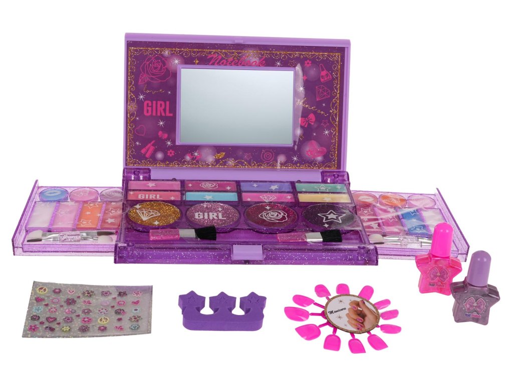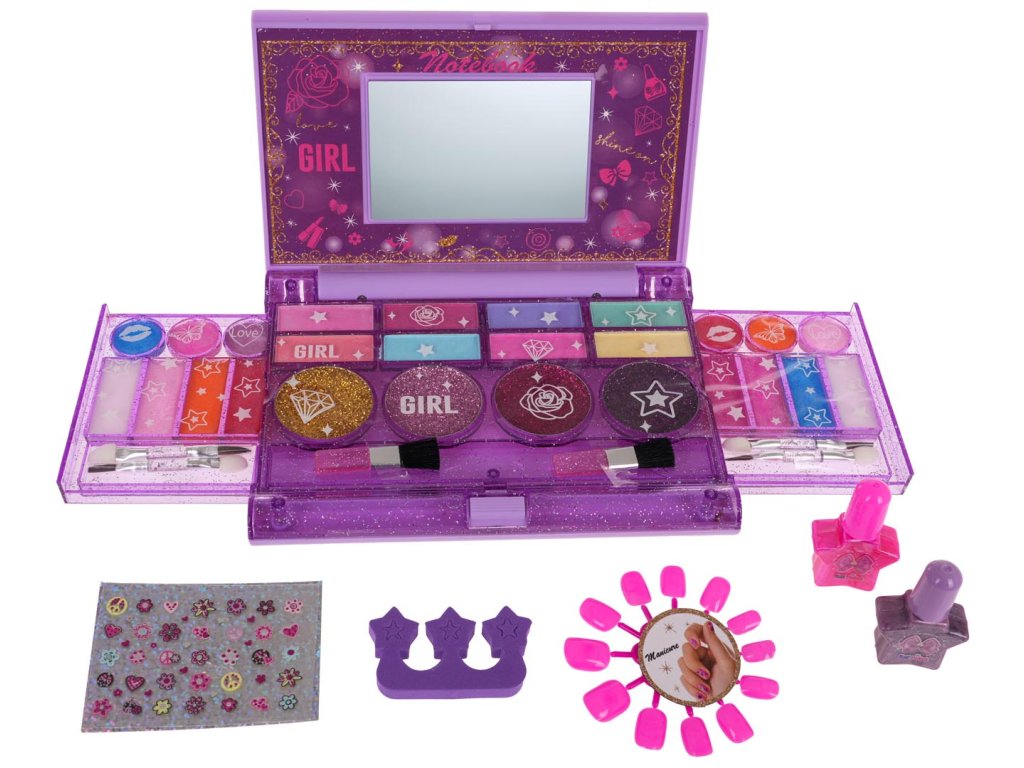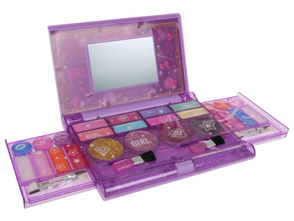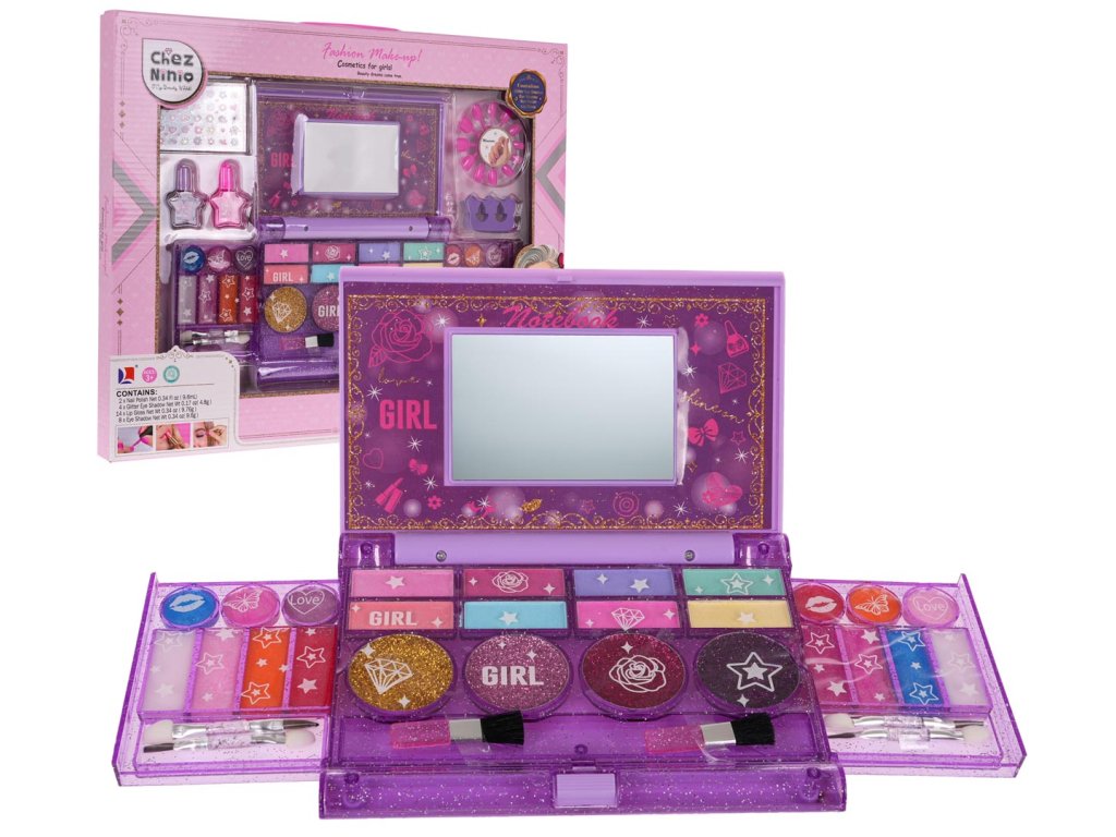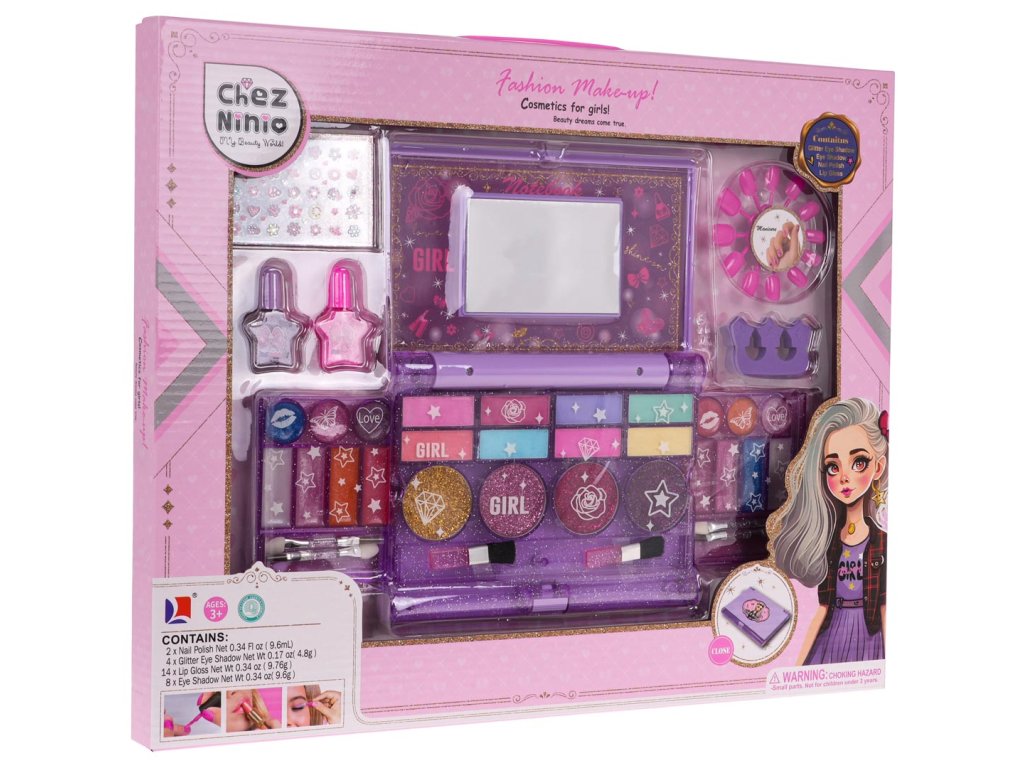 - intended for children from 3 years of age, - made of child-safe materials, - cosmetics are easy to wash off, - the set is richly equipped, includes eye shadows, lip glosses, lipsticks, brushes, nail polishes, - a convenient, foldable tablet box with a mirror for cosmetics. |