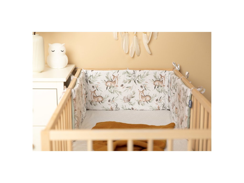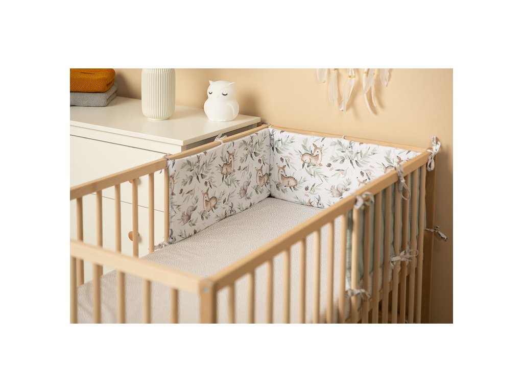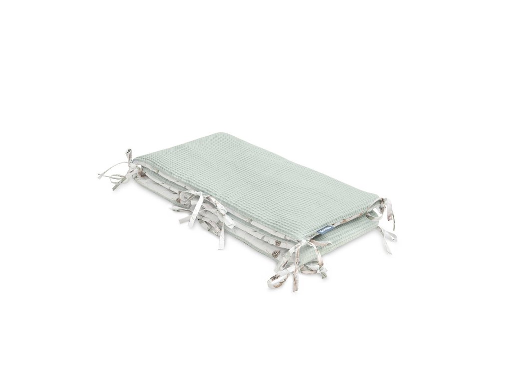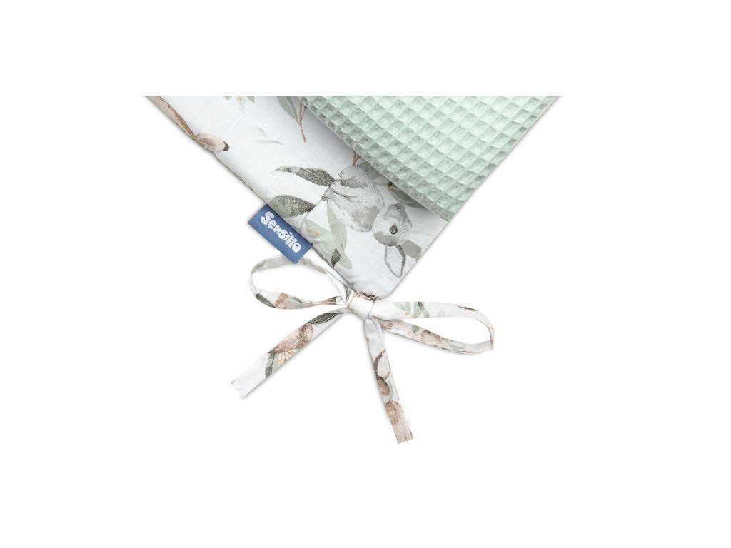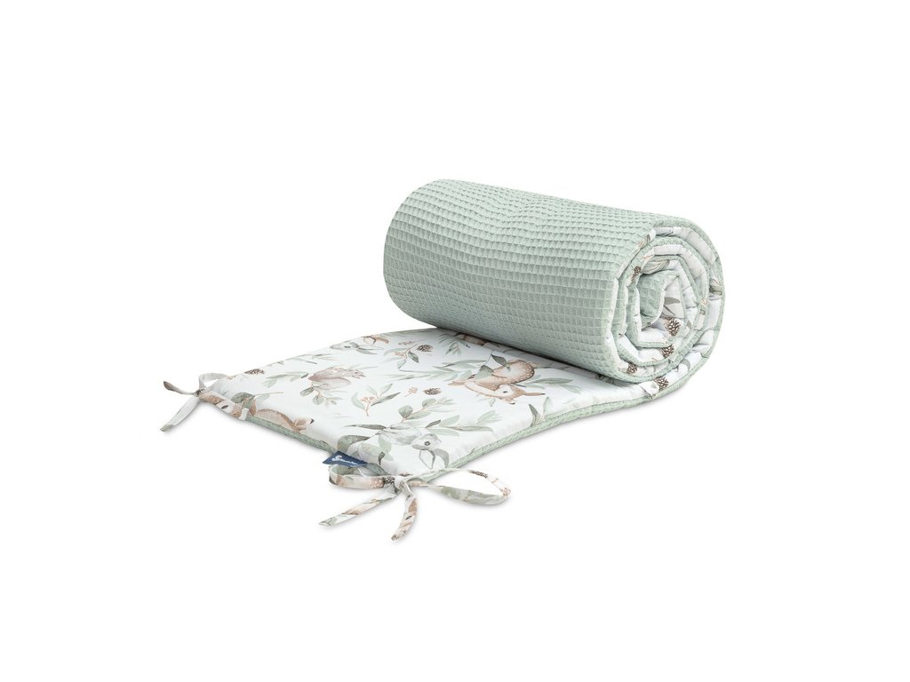 Cienki ochraniacz do łóżeczka od Sensillo to alternatywa dla grubych i ciężkich ochraniaczy powszechnie stosowanych w dziecięcych łóżeczkach. Cienkie wypełnienie z antyalergicznej owaty zapewnia odpowiednią izolację, ochroni dziecko przed urazami podczas poruszania się po łóżeczku, a przede wszystkim jest bezpieczne i minimalizuje ryzyko uduszenia się maluszka. Na niepowtarzalny wygląd ochraniacza składa się połączenie dwóch materiałów. Jedna strona wykonana została z miękkiej i przyjemnej w dotyku bawełny o strukturze wafla oraz druga z bawełny z kolorowym nadrukiem. Wszyte co ok. 30 cm tasiemki do mocowania gwarantują utrzymanie ochraniacza we właściwej pozycji.