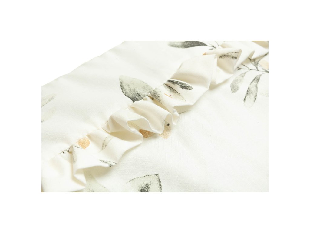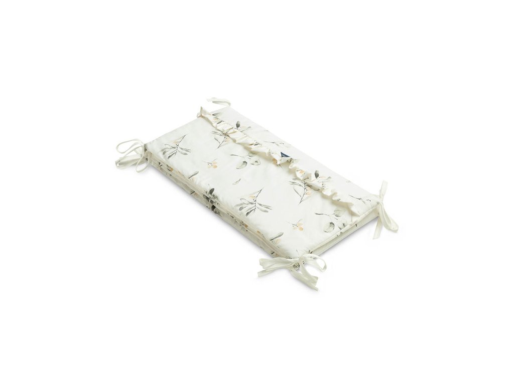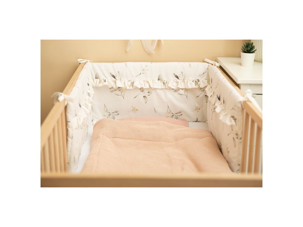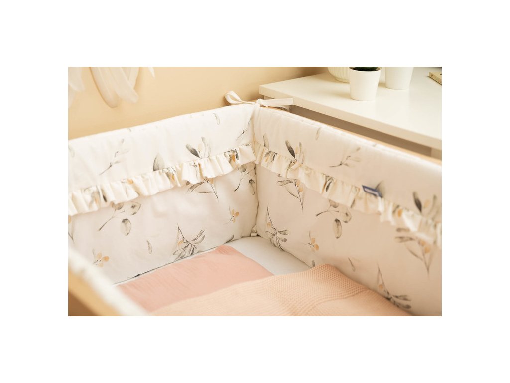 Chránič postýlky je vhodný pro každou standardní dětskou postýlku. Vyznačuje se krásnými materiály a všitými volánky, díky nimž dětský pokoj získá jedinečné kouzlo. Chránič je vyroben z měkké bavlny s potiskem. Plnění s vejčitými ochrání dítě před zraněním při pohybu po postýlce. Udržování chrániče ve správné poloze je zajištěno hustým šitím v páskách, které se používají k jeho přivázání k příčkám dětské postýlky. Byl navržen pro dětskou postýlku o rozměrech 120x60 cm. Chránič bude skvělým doplňkem k položce pro dítě.