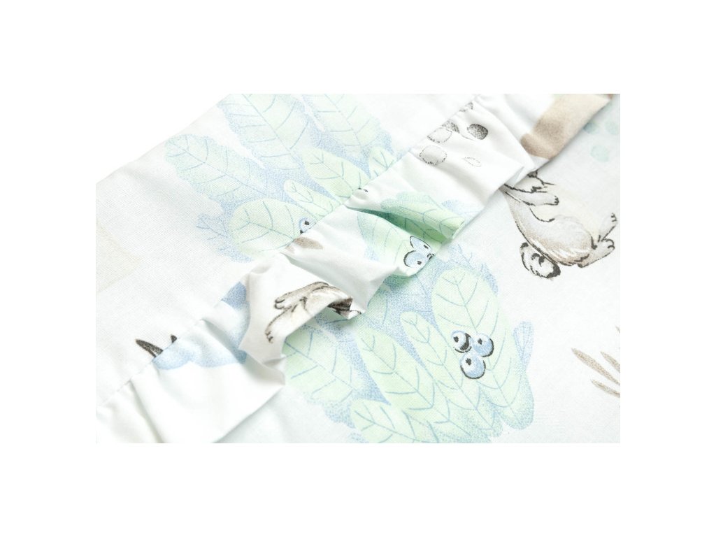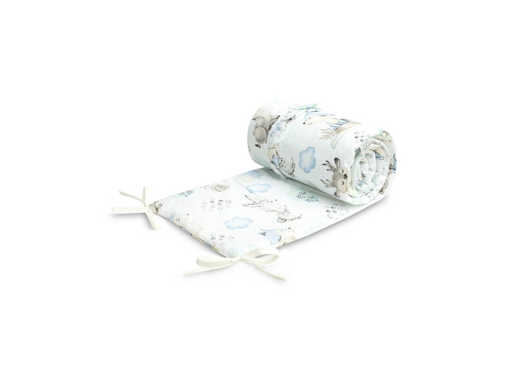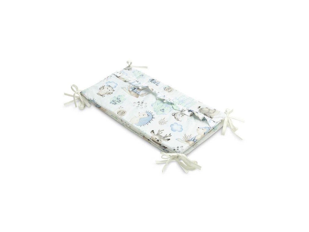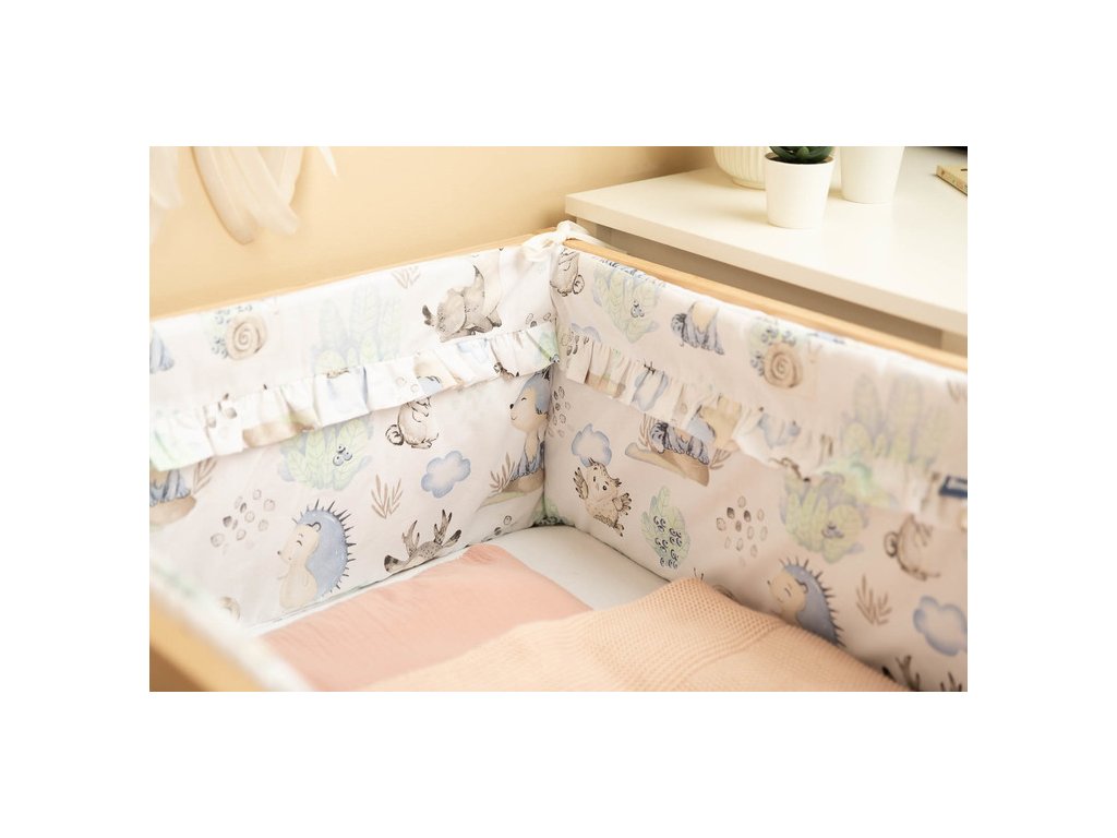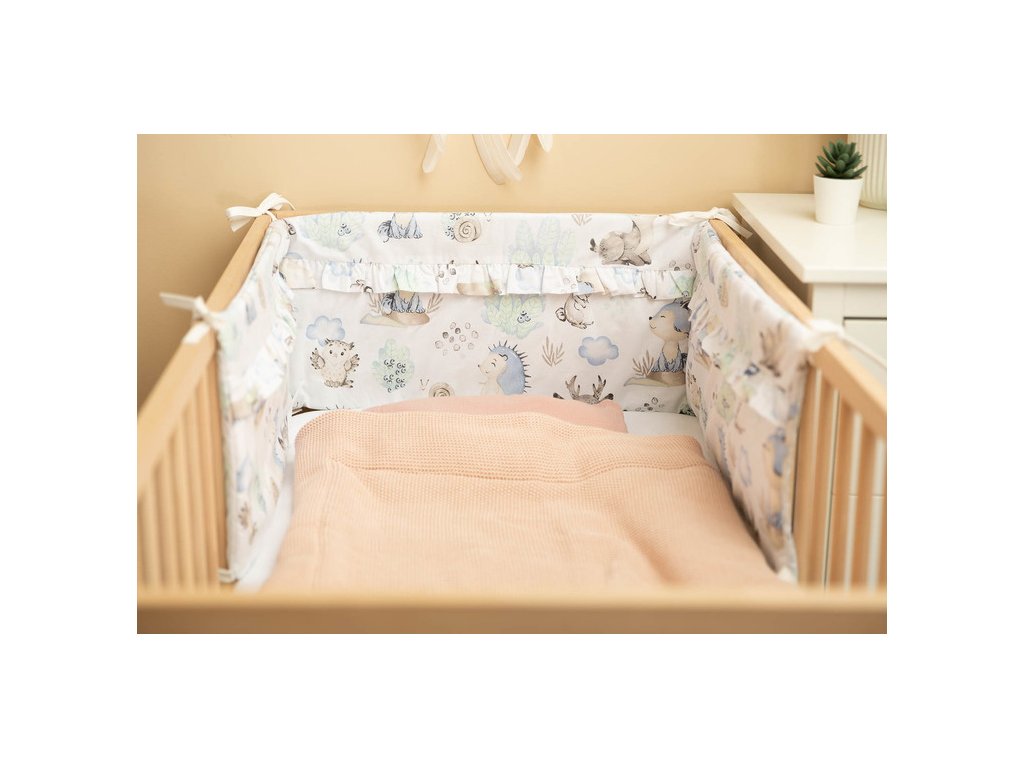 Chránič postýlky je vhodný pro každou standardní dětskou postýlku. Vyznačuje se krásnými materiály a všitými volánky, díky nimž dětský pokoj získá jedinečné kouzlo. Chránič je vyroben z měkké bavlny s potiskem. Plnění s vejčitými ochrání dítě před zraněním při pohybu po postýlce. Udržování chrániče ve správné poloze je zajištěno hustým šitím v páskách, které se používají k jeho přivázání k příčkám dětské postýlky. Byl navržen pro dětskou postýlku o rozměrech 120x60 cm. Chránič bude skvělým doplňkem k položce pro dítě.