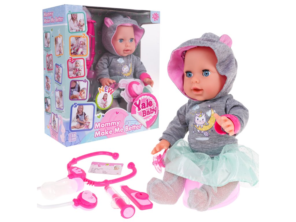 An amazing interactive doll for children from 3 years of age. The doll cries, closes and opens its eyes, drinks water, pees, moves its arms and legs, laughs and even has a fever, sneezes and coughs. The set includes many accessories, including a magnetic pacifier and doctor's accessories. Thanks to this doll, your child will learn responsibility and care for others. The "sick" doll can be given an injection, its temperature taken, and it can be listened to with a stethoscope. The toy is powered by 3 x AA 1.5V batteries, batteries are not included. The stethoscope is powered by 2 x AG13 batteries, batteries are included in the set. Doll Features: - has sound effects such as crying, laughing, sneezing, coughing, gurgling, snoring, - closes and opens eyes, - moves arms and legs (manually), - drinking water, - pees in the potty, - "feverish" - her cheeks light up, - has a magnetic pacifier that "calms" the doll, - has many accessories. |