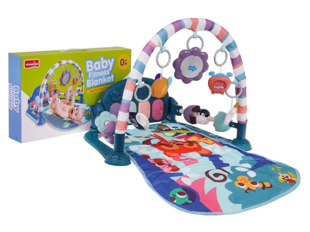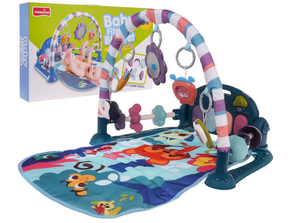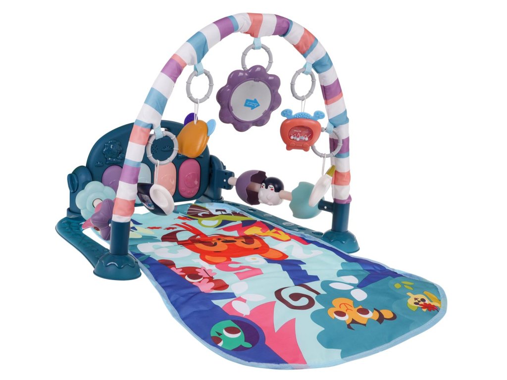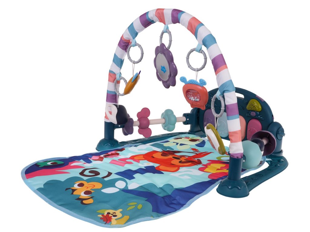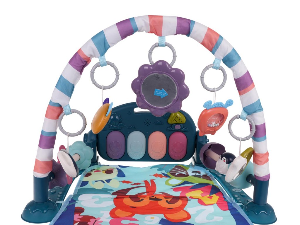 Interactive, multifunctional mat for the youngest from the first days of life. The set consists of a comfortable mat for a baby, a bar with pendants and a piano. The mat grows with the child. In the first period of life, up to the age of six months, the baby can lie on a comfortable mat, kicking the piano with its feet, and moving its hands trying to reach the pendants on the bar. Between the sixth and twelfth month, the set will be extremely helpful in learning to sit. An older child can already play the piano on its own. The piano can be very easily transformed into a music table using the adjustment knobs located on the side of the structure. We can tilt the piano in several positions, or disconnect it from the set and take it to different places. Additionally, the piano has a comfortable handle for carrying. The toy is powered by 3 x 1.5 V batteries (not included). The piano has a volume control, an on/off switch, 4 keys with melodies, notes and animal sounds. The bow has 4 rattle pendants and a mirror. On the sides of the base we have beaded interleaves.