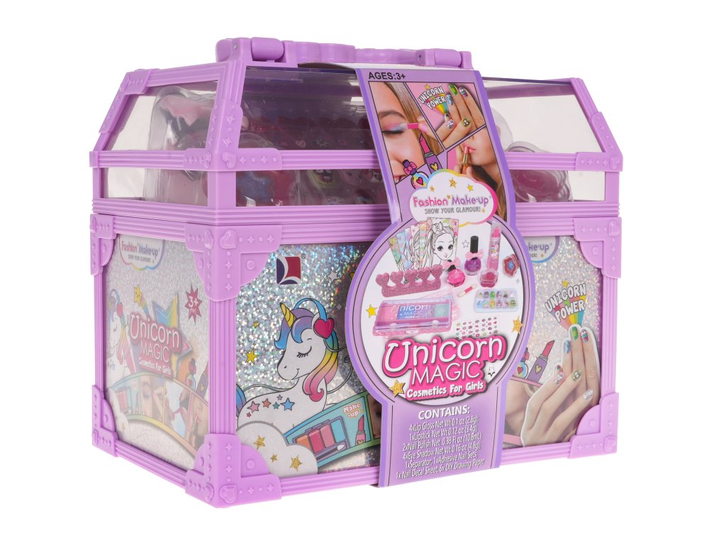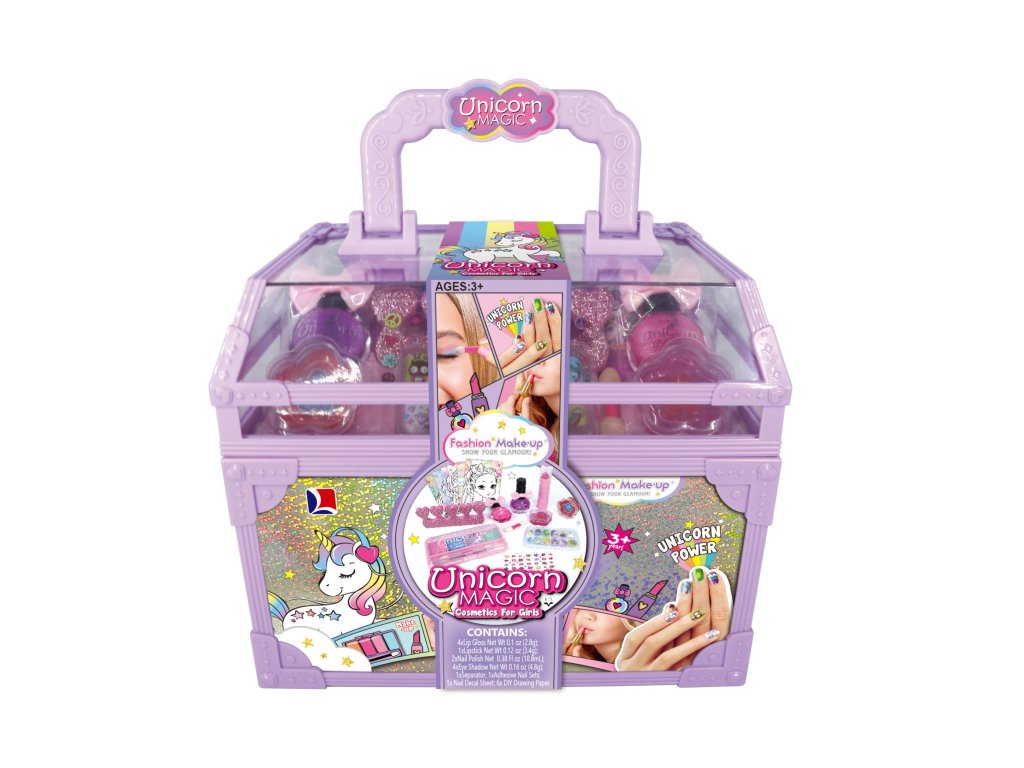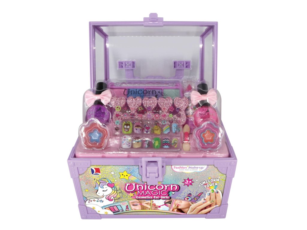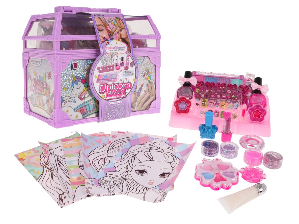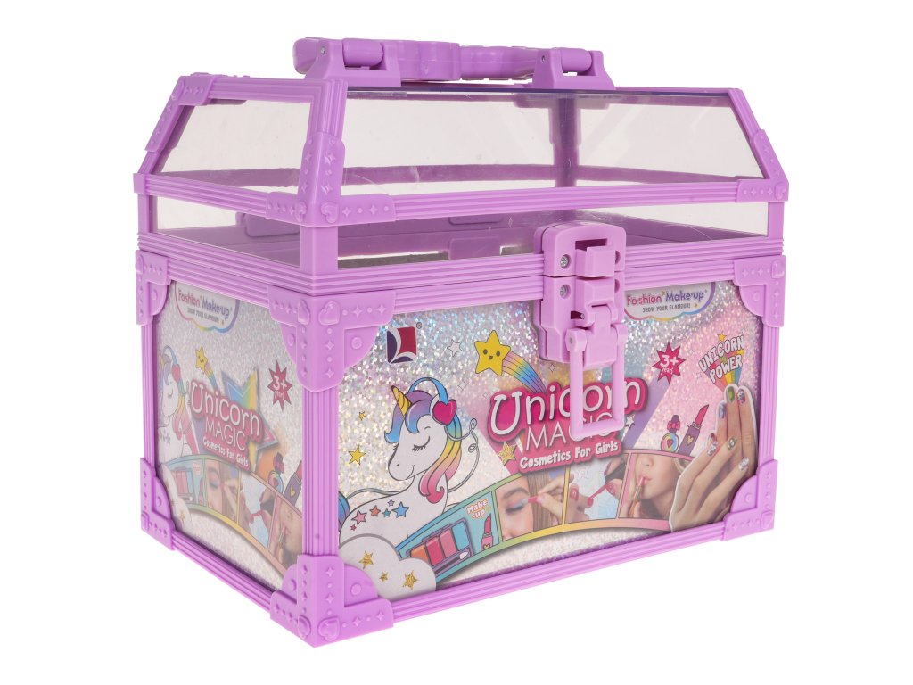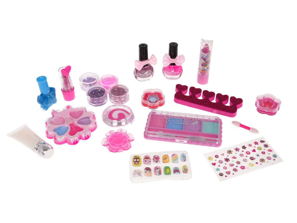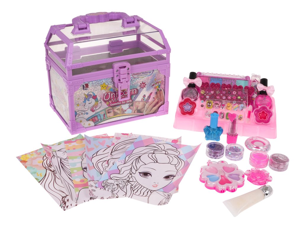A set of cosmetics in a unicorn box is a proposition for children from 3 years of age. A large, roomy box with a carrying handle will accommodate all the little fashionista's cosmetics. The set consists of many cosmetics that are safe for children. Note: only our set includes additional elements such as: lipstick, four eye shadows with a brush, lip gloss in a tube, nail polish, three lip glosses in a round package, heart-shaped applications and two packages of glitters . |