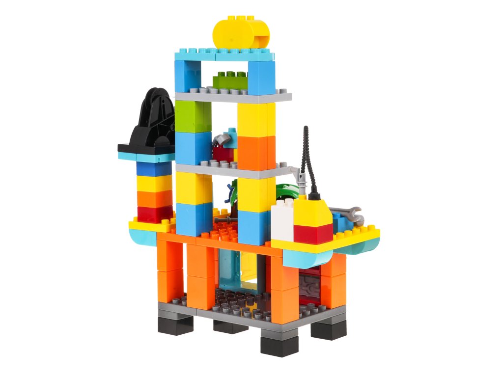 - workshop construction elements, - lift, - a machine for pumping air into wheels, - toy car, - screwdriver, - 2 x wrench, - gear, - opening cabinets, - decorative stickers, - manual. |