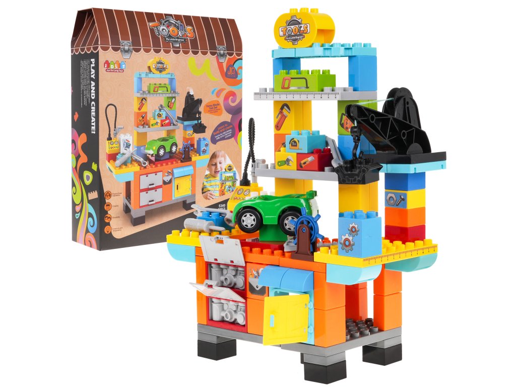 A set of construction blocks to build a workshop for children from 3 years of age. The blocks are made of the best quality materials, they are safe for children and very colorful. The workshop was equipped with one car, tools - a screwdriver, a wrench, a jack and even a machine with a gun for pumping air into the wheels. The entire set consists of 92 elements. |