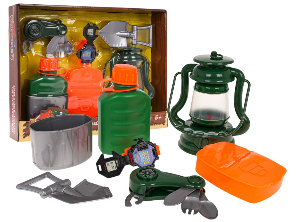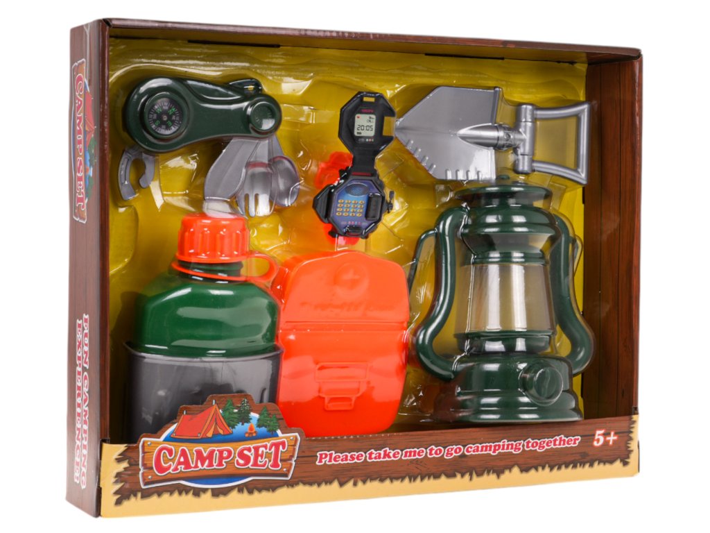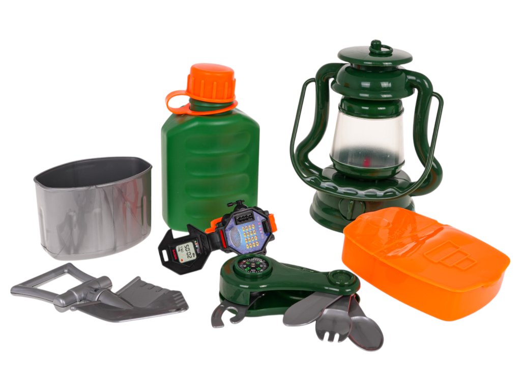 Camping set for children from 3 years of age. The set includes: a lamp, a canteen, a toolbox, a watch, a food container and a shovel. With this set, your child will feel like a real explorer. The lamp is powered by 3 x AG13 batteries (included).