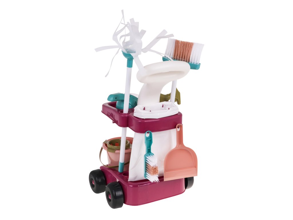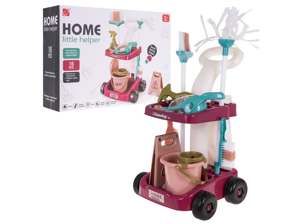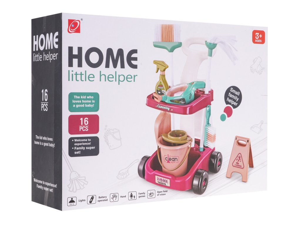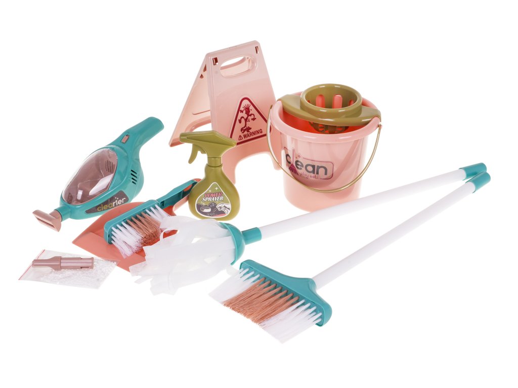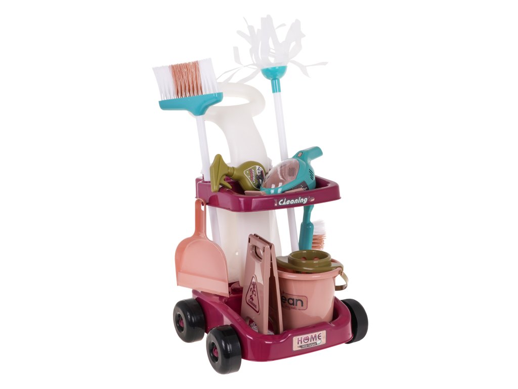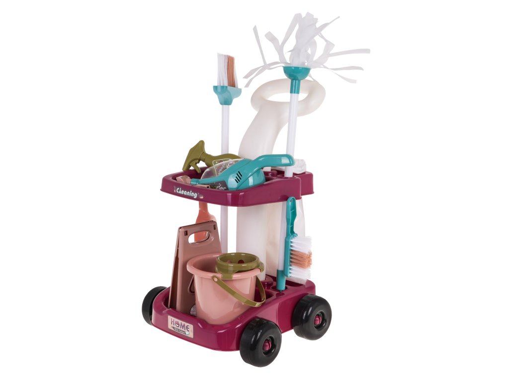 - accessories trolley for self-assembly, - hand vacuum cleaner, - bucket with mop, - broom, - shoulder, - dustpan, - dummy washer, - warning sign about slippery floor, - styrofoam balls, - replaceable vacuum cleaner attachments: suction and crevice, - plastic garbage bag, - decorative stickers. |