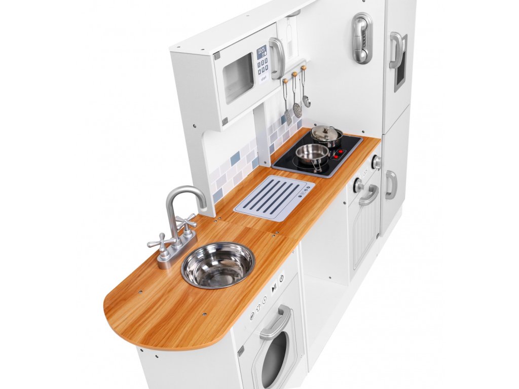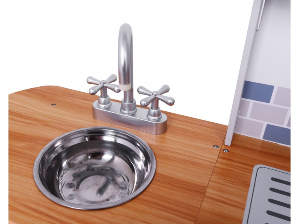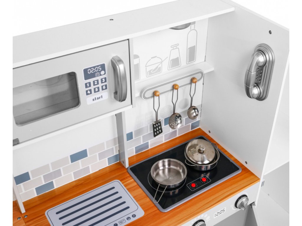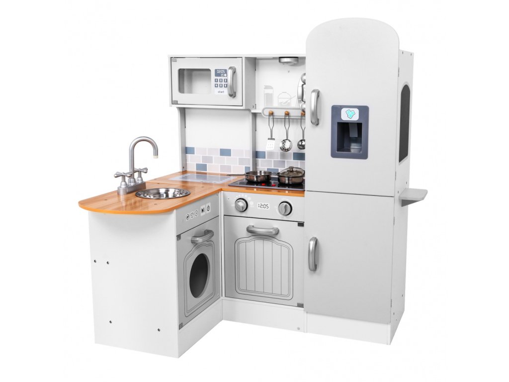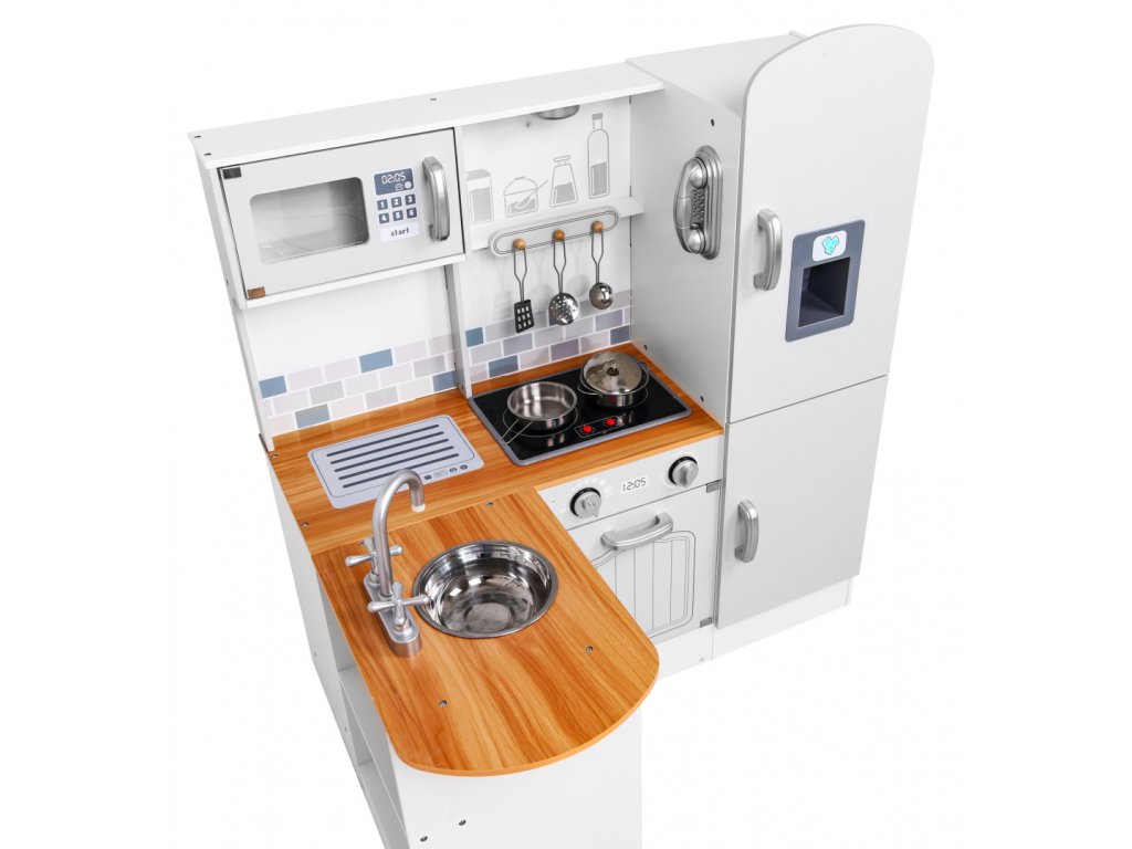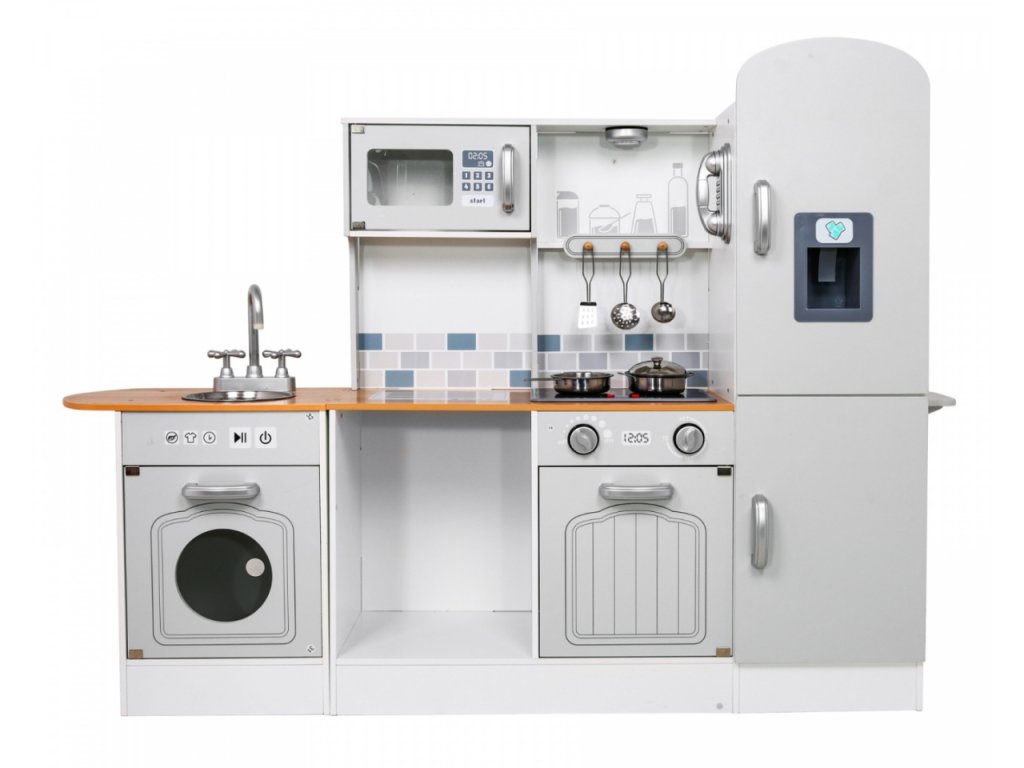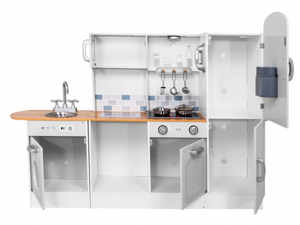 | A large wooden kitchen is a proposal for children from 3 years of age. It is made of high-quality wood, a solid and durable material, it is stable and resistant to external damage, it will serve your children for many years. It looks like a real kitchen, the color is neutral, it will be suitable for both boys and girls. Playing with the kitchen teaches creativity, develops imagination, positively influences the development of your child and at the same time provides a lot of positive emotions and impressions. The kitchen has sound and light effects. LED lights above the hood, illuminated burners. Sound effects such as the sound of cooking and frying. The kitchen set presented by us consists of many elements such as: - fridge with ice-cream maker, - lockable cabinet, - Microwave, - washing machine, - oven, - tap, - sink, - dummy phone, - pan, - a pot with a lid, - ladle, - colander, - spatula. The package includes the assembly instructions for the kitchen. The set is powered by AAA batteries (3 x 1.5 V) - LED lights above the hood, 2x AA (2 x 1.5V) - heating top. |