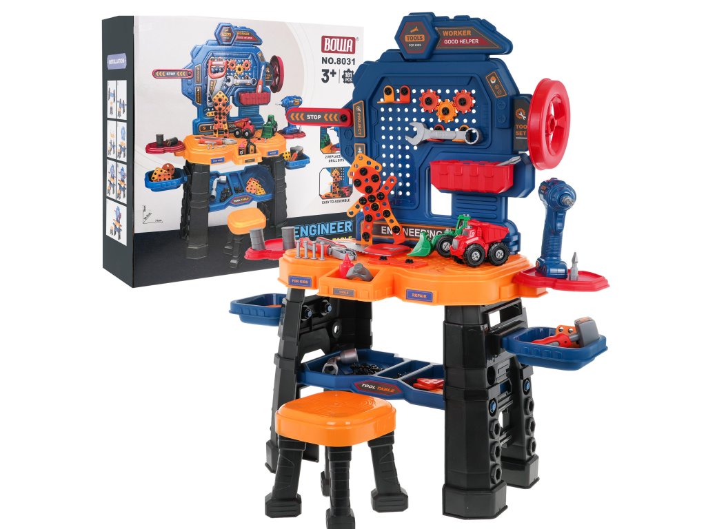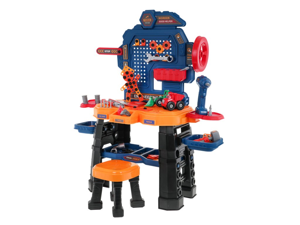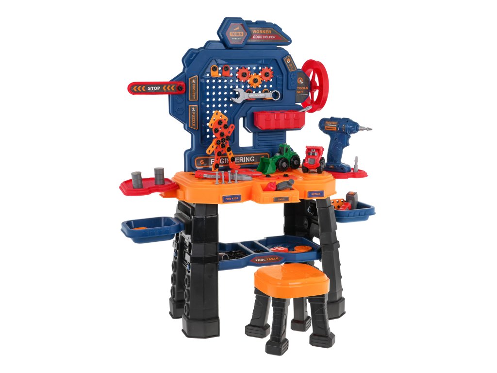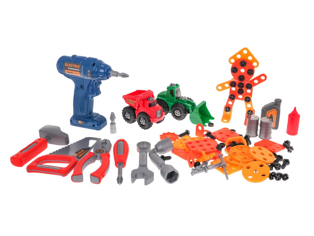 - workbench with movable barrier, rotating wheel, shelves on the sides and bottom, - drill/driver with replaceable tips, - 2 x replaceable screwdriver tips, - stool, - hammer, - saw, - screwdriver, - oil canister, - 2 x self-assembly construction vehicle, excavator with movable arm and dumper, - pincers, - combination wrench, - wrench for loosening and twisting screws, - oil barrel, - paint barrel, - 4 x pin, - 36 x screws for screwing, - 36 x seal, - 3 x gear wheel, - bottle, - 6 square elements for screwing in screws, - 6 round elements for screwing in screws, - 6 triangular elements for screwing in screws, - 6 rectangular elements for screwing in screws, - 6 corners for screwing in screws, - decorative stickers. |