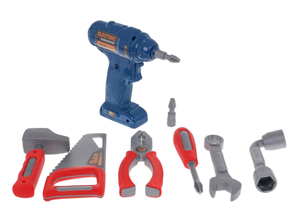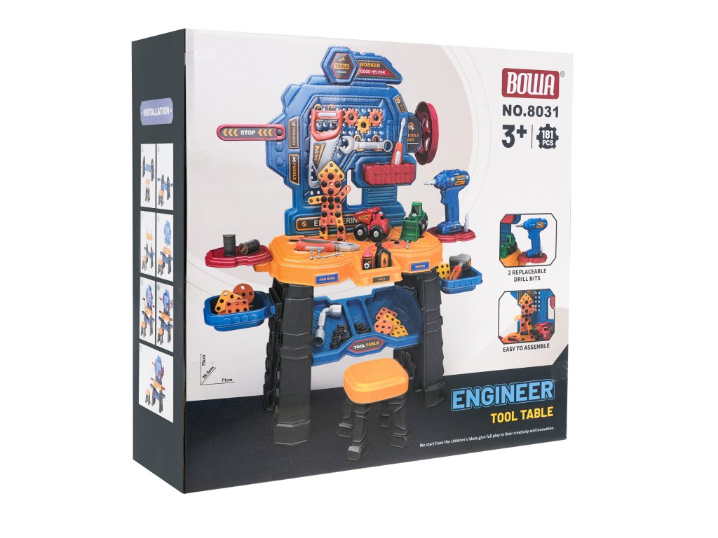 A large DIY set with a table, a stool and a battery-powered screwdriver with replaceable tips is suitable for children from 3 years of age. The set is made of high-quality materials. The set includes 181 elements. Your child can assemble a DIY table - workshop and place all the tools necessary for a mechanic's work on it. The set includes at least: tools such as a drill with interchangeable tips, saw, screwdriver, wrenches, hammer, pliers and many screws to tighten and loosen. The drill is powered by 2 x 1.5V AA batteries (batteries not included), it can be used to screw in and remove screws. |