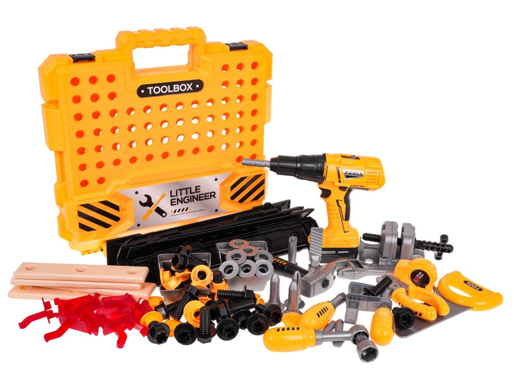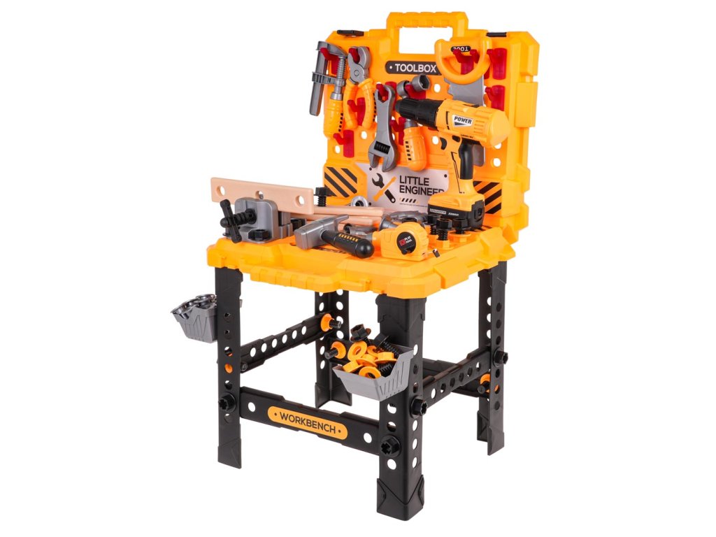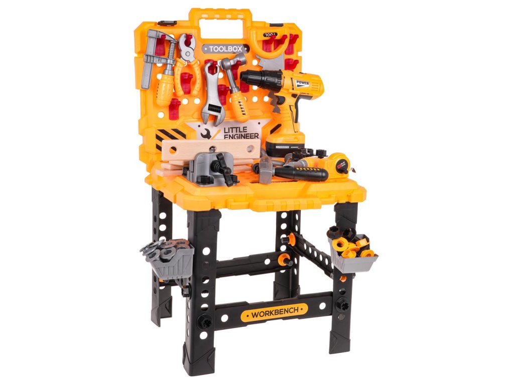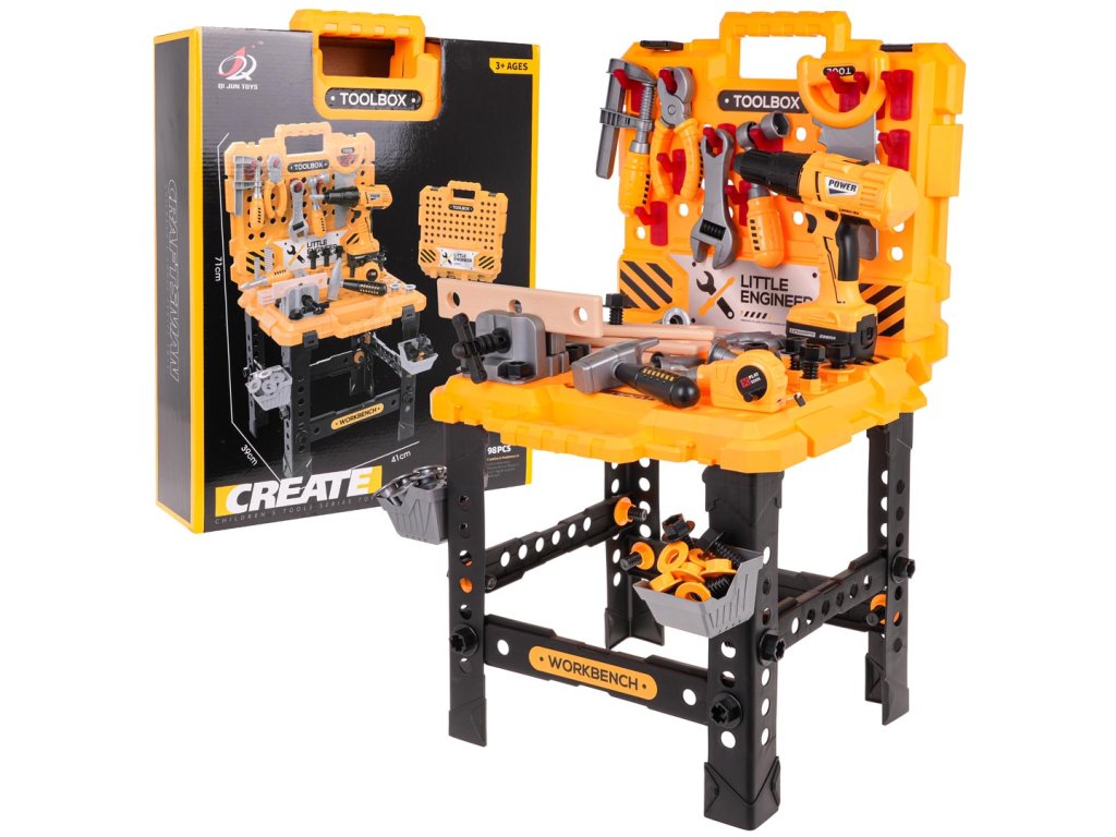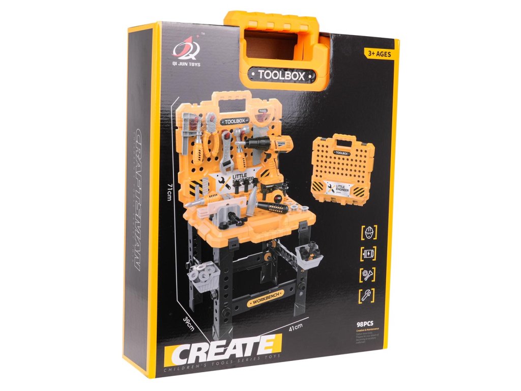 - intended for children from 3 years of age, - made of the best quality materials, - possibility of building a workbench and a tool case, - richly equipped with as many as 98 elements, - battery-powered drill/driver, - replaceable drill bits, - the drill screws and unscrews, - the sounds of a drill/driver working, - the drill has a removable battery, - movable vice. |