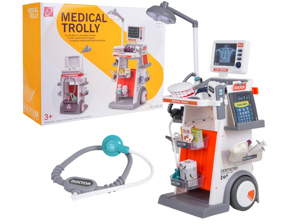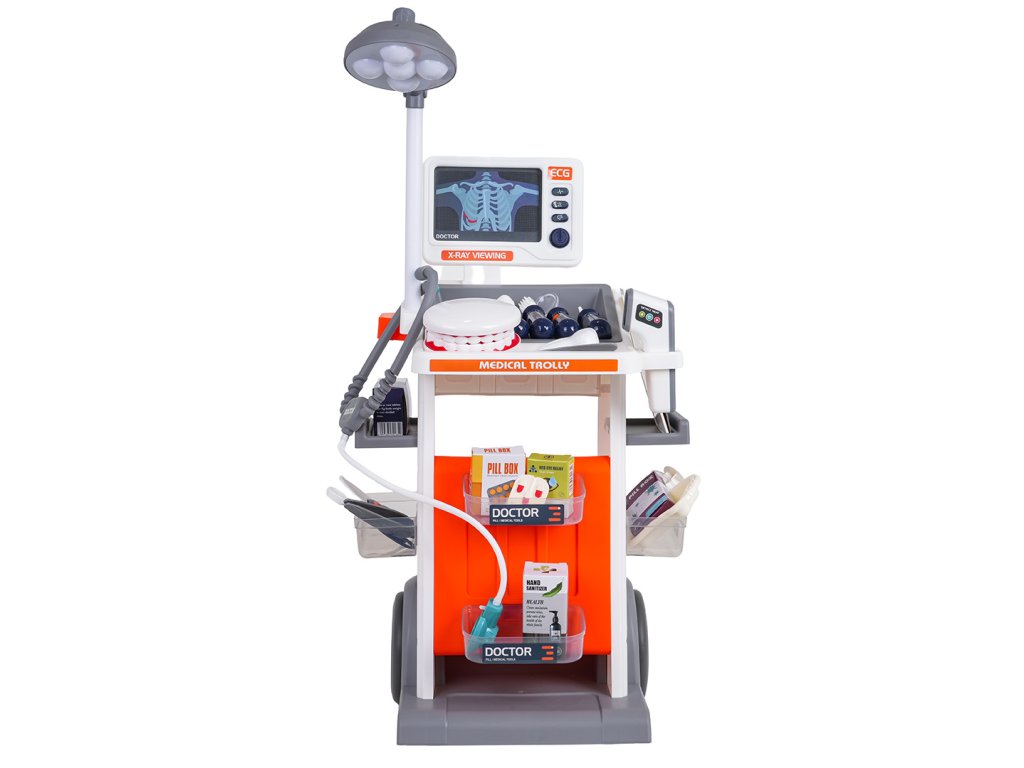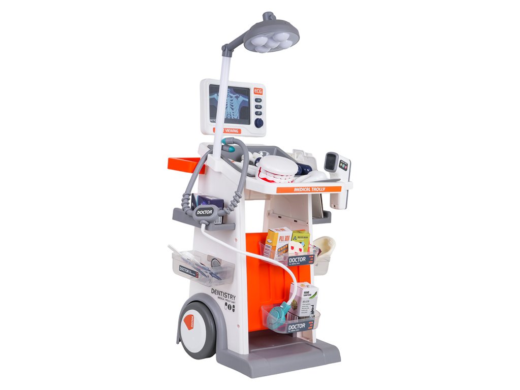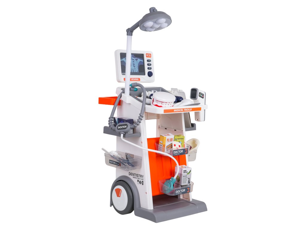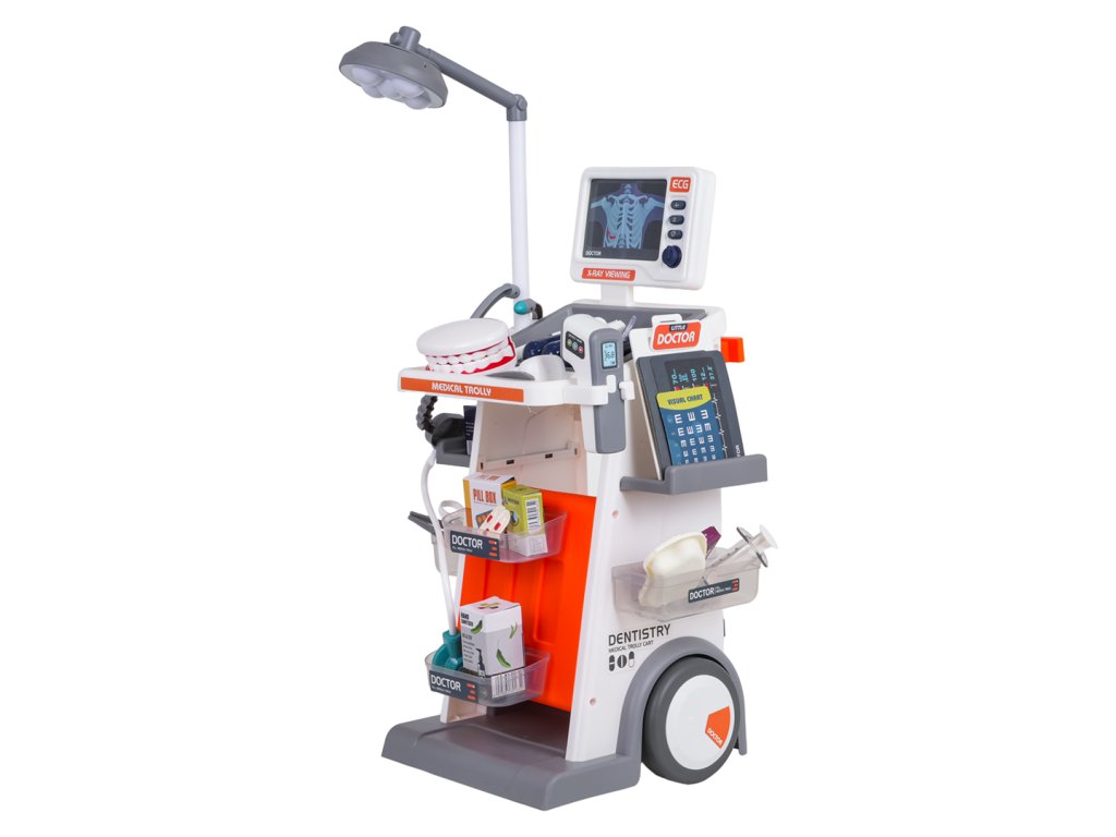 A well-equipped medical and dental set with a cart, sound, and light effects for children aged three and up. All components are made of high-quality plastic. The cart has large wheels and is easy to maneuver. It holds all medical and dental accessories on its shelves . A panel with sound and light effects and interchangeable attachments for X-rays is located on top of the cart. The dental mirror and thermometer are backlit, and the stethoscope has heartbeat sounds. The lamp on the cart is also backlit. The set looks great; your child can pretend to be a doctor. The lamp is powered by 2 x AA 1.5V batteries (not included), the thermometer by 2 x AAA 1.5V batteries (not included), the dental mirror by 2 x AG10 batteries (included), the stethoscope by 2 x AG13 batteries (included), the ECG panel by 2 x AAA 1.5V batteries (not included).