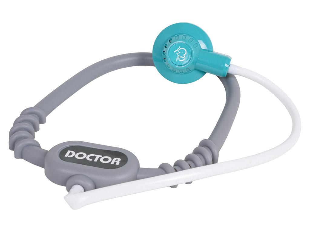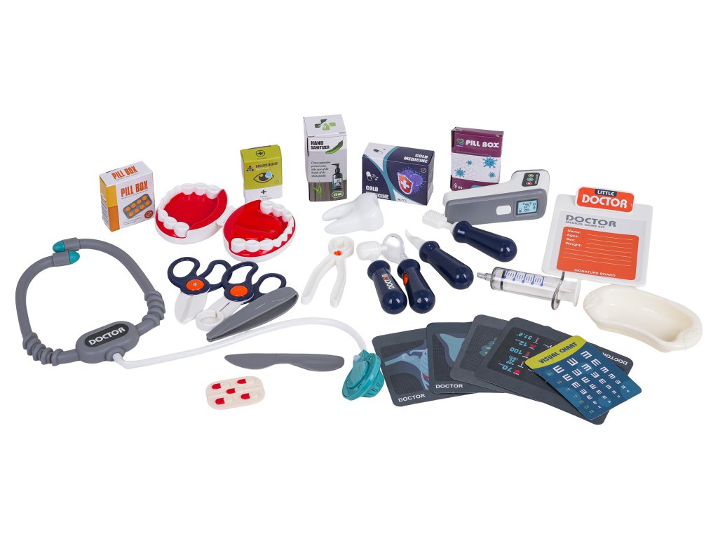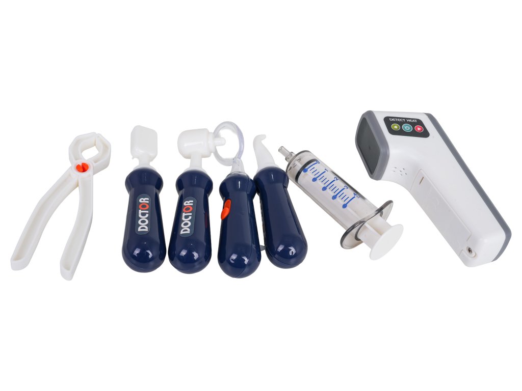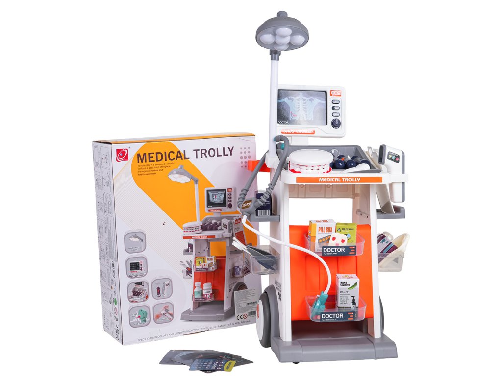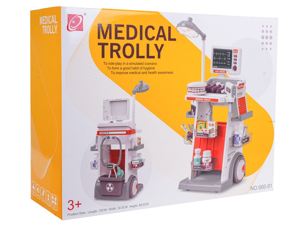 A well-equipped medical and dental set with a cart, sound, and light effects for children aged three and up. All components are made of high-quality plastic. The cart has large wheels and is easy to maneuver. It holds all medical and dental accessories on its shelves . A panel with sound and light effects and interchangeable attachments for X-rays is located on top of the cart. The dental mirror and thermometer are backlit, and the stethoscope has heartbeat sounds. The lamp on the cart is also backlit. The set looks great; your child can pretend to be a doctor. The lamp is powered by 2 x AA 1.5V batteries (not included), the thermometer by 2 x AAA 1.5V batteries (not included), the dental mirror by 2 x AG10 batteries (included), the stethoscope by 2 x AG13 batteries (included), the ECG panel by 2 x AAA 1.5V batteries (not included).