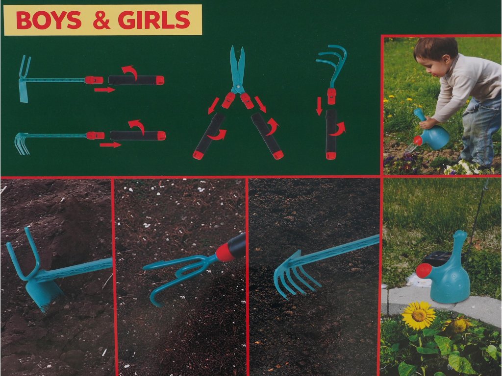 A set of safe gardening tools for children from 3 years of age. The set includes everything you need to work in the garden. The tools are safe, have no sharp edges, and their size is perfectly suited to small hands. In addition, the tool handles are removable. The set is made in universal colors, perfect for both boys and girls. |