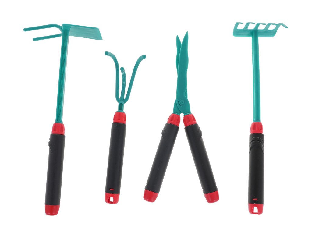 -Gloves - a large watering can, -hoe - manual cultivator, -scissors - rakes. |