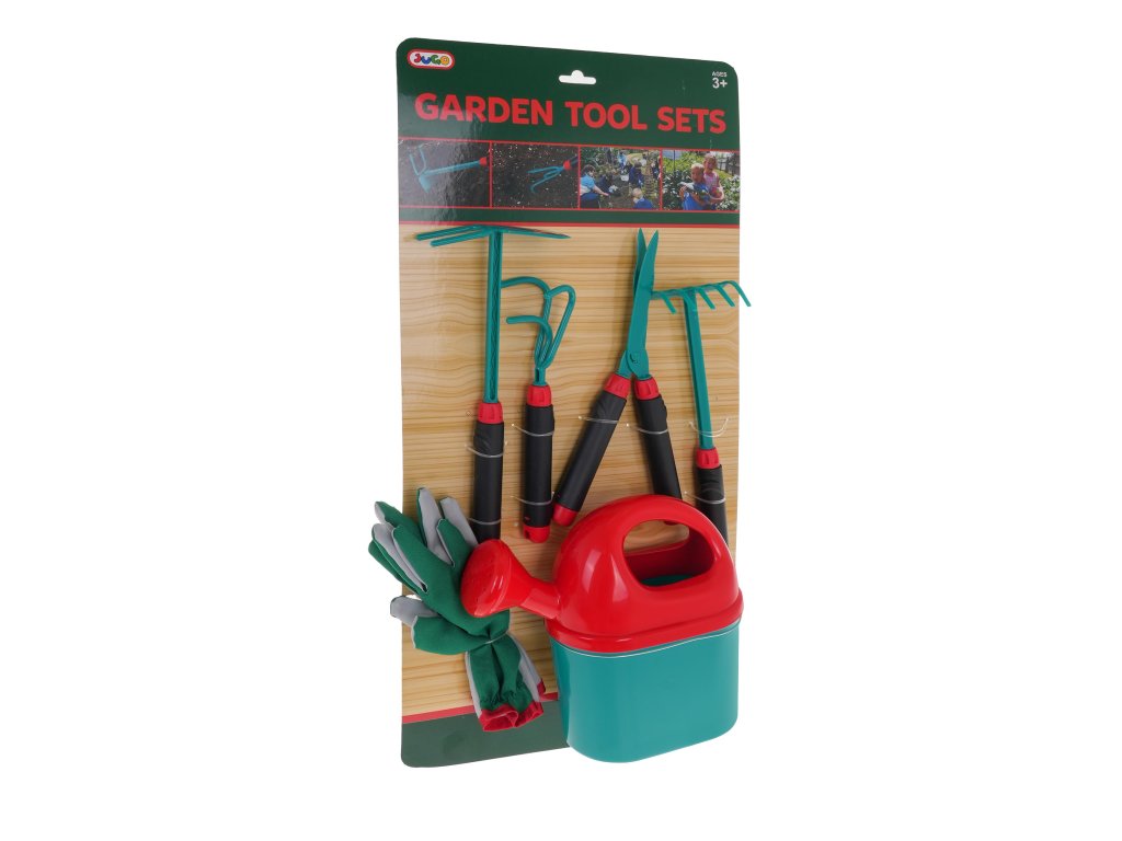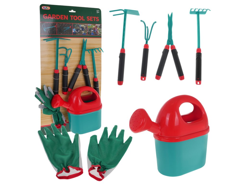 - gloves approx. 21.5 cm x 12.5 cm, width at the top 7.5 cm to 10.5 cm, fingers length approx. 6 cm, - large watering can approx. 22 cm x 19.5 cm x 8 cm, - hoe approx. 26.5 cm x 10.5 cm x 4.5 cm, - manual cultivator approx. 21 cm x 5.5 cm x 5 cm, - scissors approx. 24 cm x 9 cm x 2 cm, - rake approx. 26 cm x 6.5 cm x 5 cm, - package approx. 28 cm x 58 cm x 8 cm. |