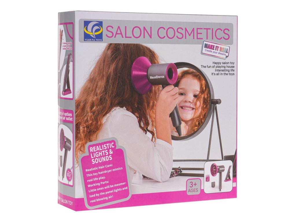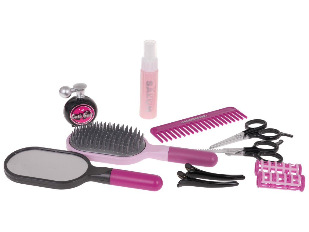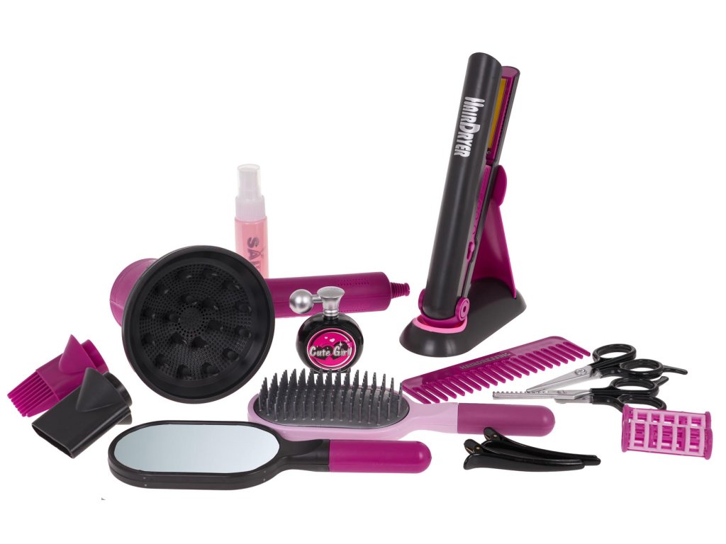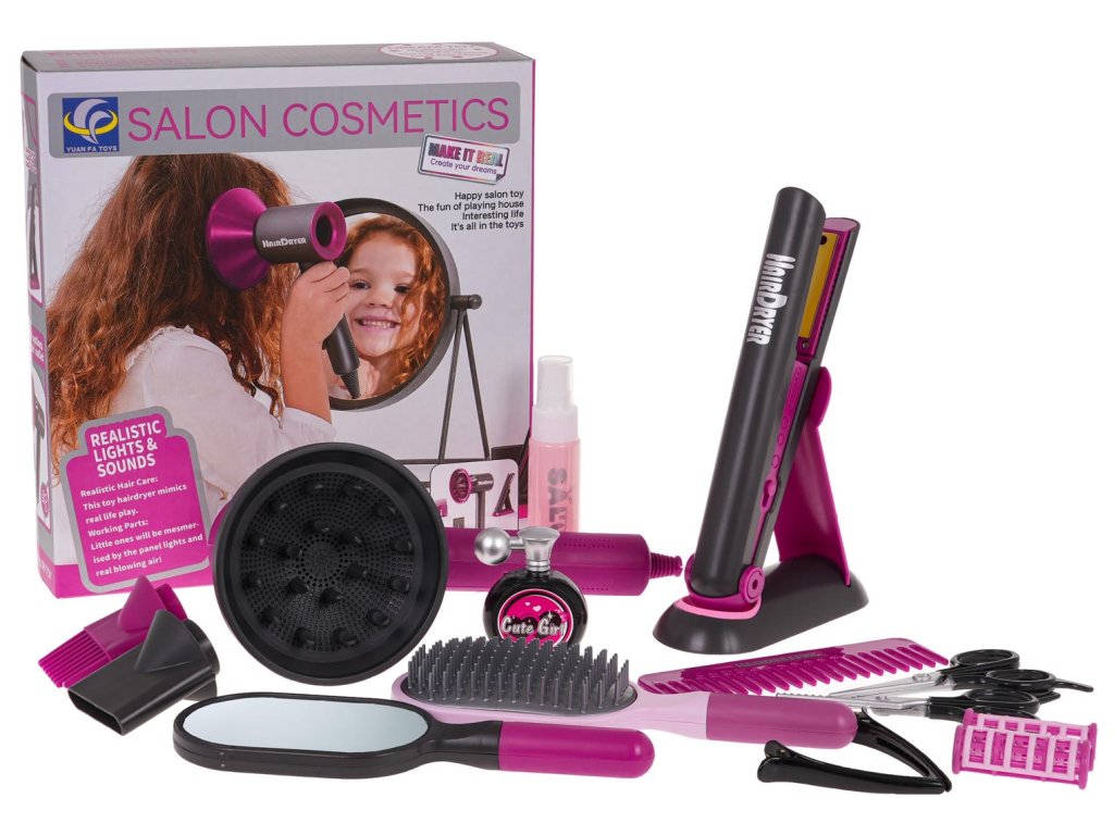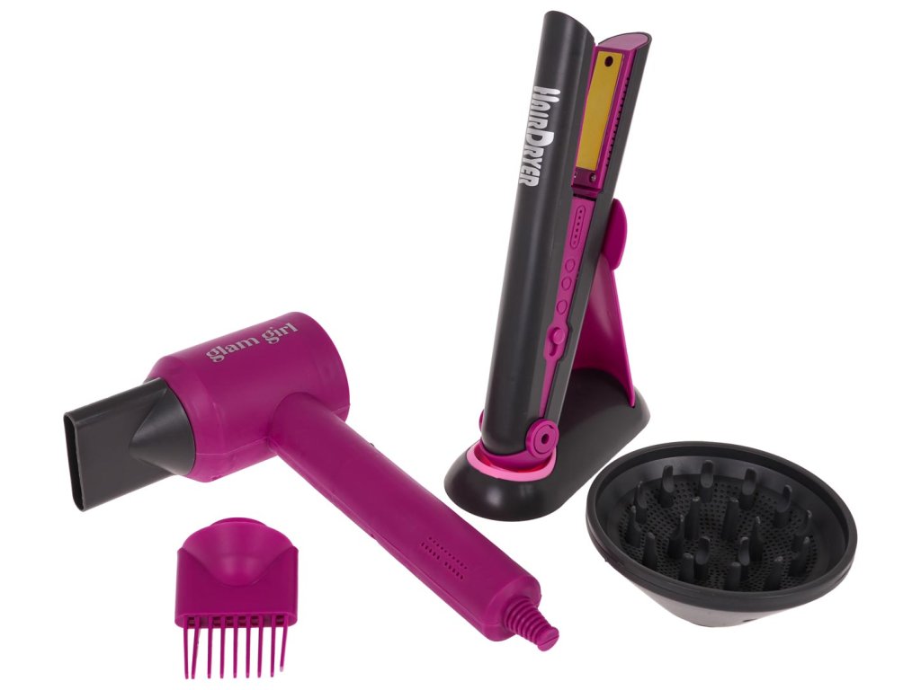 An interactive, richly equipped hairdressing set with a hair dryer with replaceable nozzles and a battery-powered hair straightener is a proposal for children from 3 years of age. The set includes a wide range of tools necessary in the work of a hairdresser, including a hair dryer, straightener, scissors, hair combs and other accessories. The hair dryer makes a drying sound and emits a stream of air. The straightener has light effects and sounds accompanying hair straightening. The hair dryer is powered by 2 x AA batteries (not included), the straightener by 2 x AAA batteries (not included). Set Features: