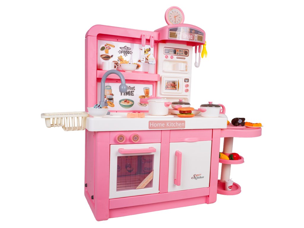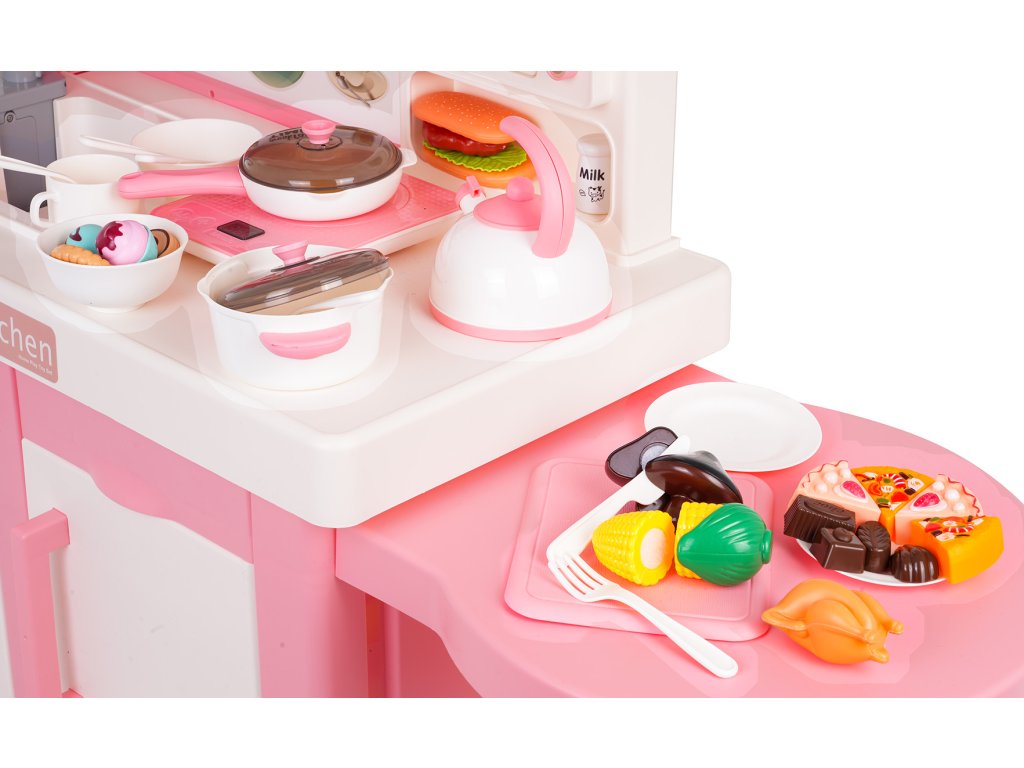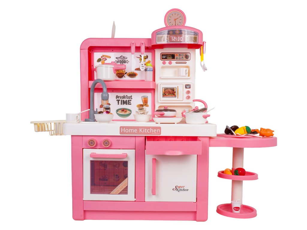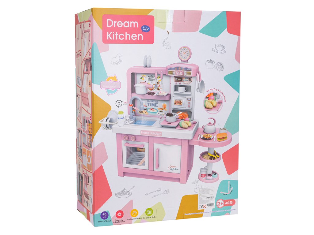 An interactive, fully equipped kitchen with sound, light, and steam effects for children aged three and up. All elements are made of the highest quality, child-safe materials. The kitchen features a pink and white color scheme, making it a perfect addition to any child's room. The toy kitchen includes a microwave, sink with a faucet, induction cooktop, oven, coffee maker, refrigerator, dessert stand, and a wealth of kitchen accessories, including pots, cutlery, plates, kettle, cups, and mock food items. Water actually flows from the faucet, and the induction cooktop is illuminated, has a temperature display, and makes realistic cooking and frying sounds. An additional attraction is the release of safe (cool) steam from one of the pots. The faucet is powered by 2 x 1.5V AA batteries (not included), while the induction cooktop is powered by 3 x 1.5V AAA batteries (not included).