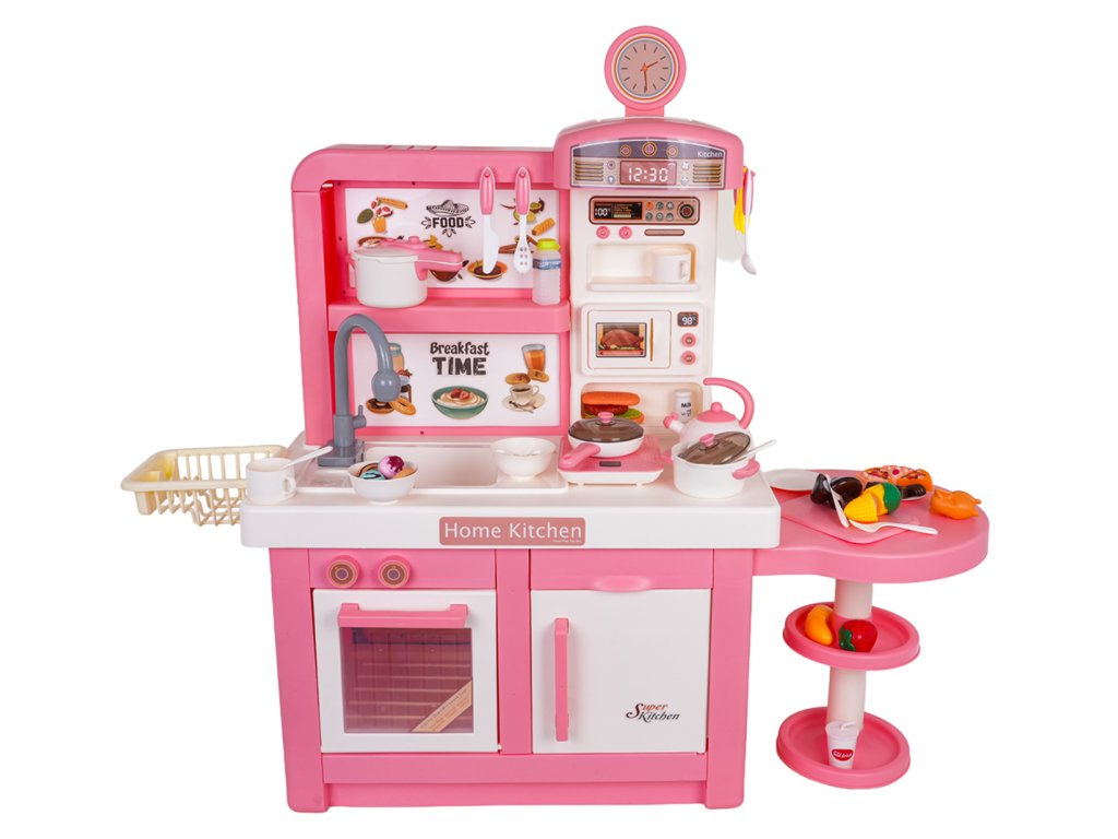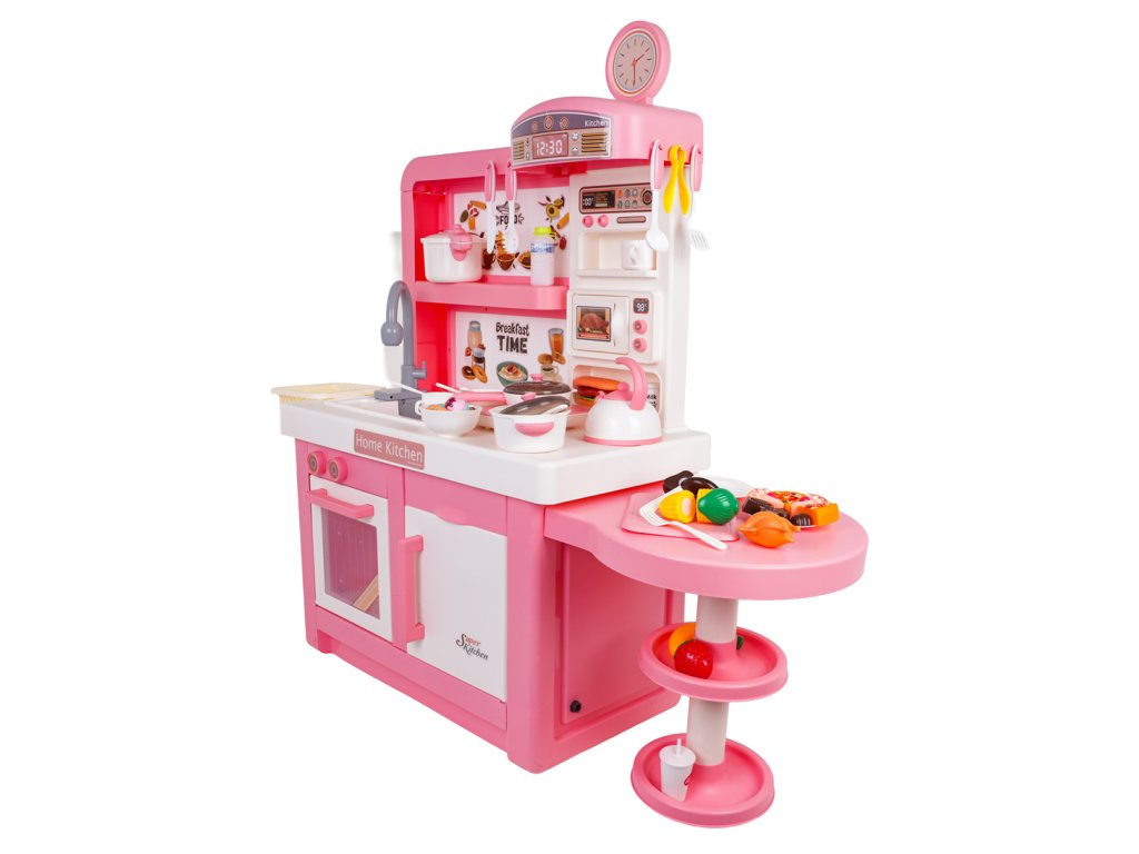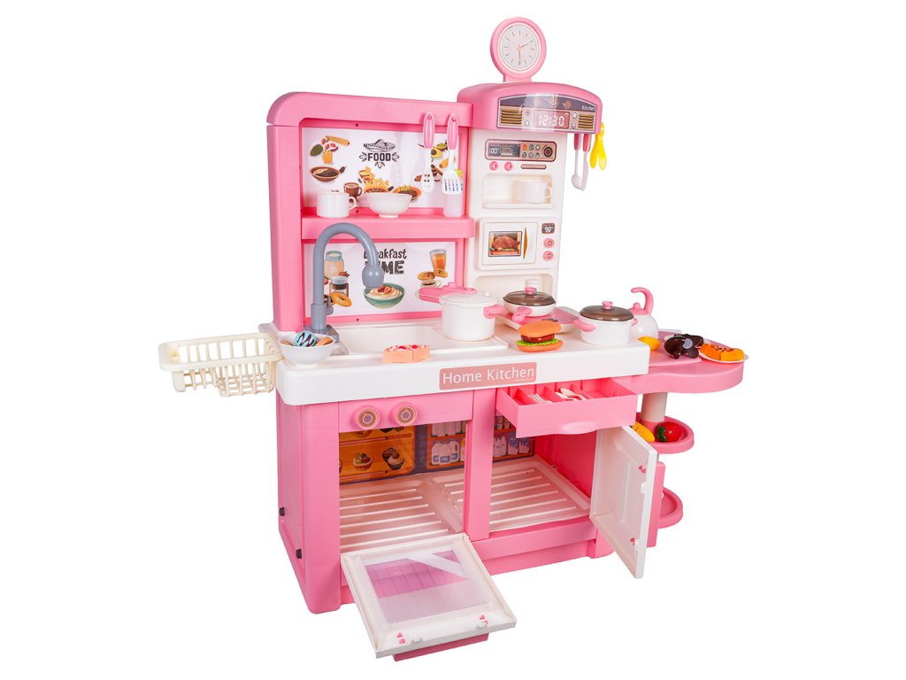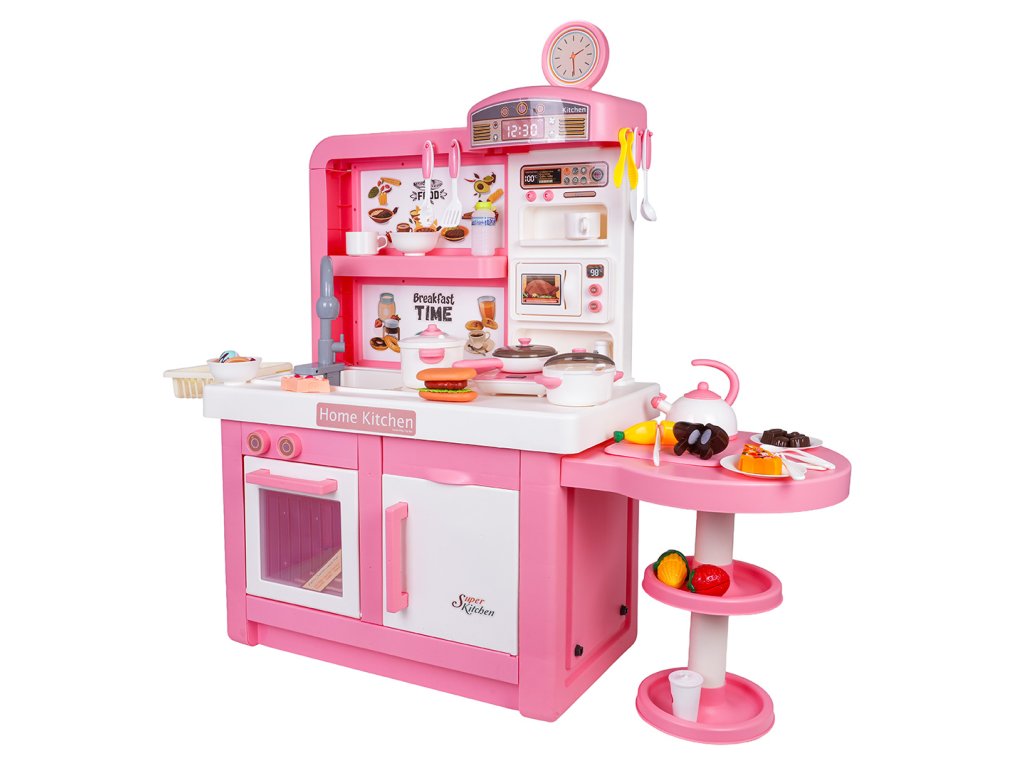An interactive, fully equipped kitchen with sound, light, and steam effects for children aged three and up. All elements are made of the highest quality, child-safe materials. The kitchen features a pink and white color scheme, making it a perfect addition to any child's room. The toy kitchen includes a microwave, sink with a faucet, induction cooktop, oven, coffee maker, refrigerator, dessert stand, and a wealth of kitchen accessories, including pots, cutlery, plates, kettle, cups, and mock food items. Water actually flows from the faucet, and the induction cooktop is illuminated, has a temperature display, and makes realistic cooking and frying sounds. An additional attraction is the release of safe (cool) steam from one of the pots. The faucet is powered by 2 x 1.5V AA batteries (not included), while the induction cooktop is powered by 3 x 1.5V AAA batteries (not included).
