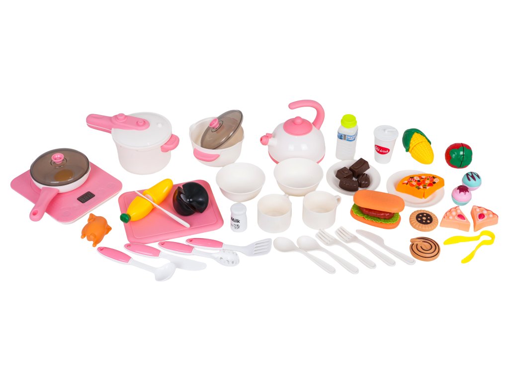 - kitchen with a dessert stand, sink, dish drainer, induction cooker, clock, - kettle, - pressure cooker, - pot with lid, - frying pan with lid, - 2 x flat plate, - 2 x bowl, - 2 x cup, - large knife, pasta spoon, ladle, spatula, - 2 x knife, 2 x fork, 2 x spoon, - mock food products: mushroom on turnip, strawberry on turnip, corn on turnip, banana on turnip, chicken, cutlet, fried egg, lettuce, 4 x cookies, 4 x chocolate, 2 x slices of pizza, 2 x slices of cake, milk, mineral water, coffee. |