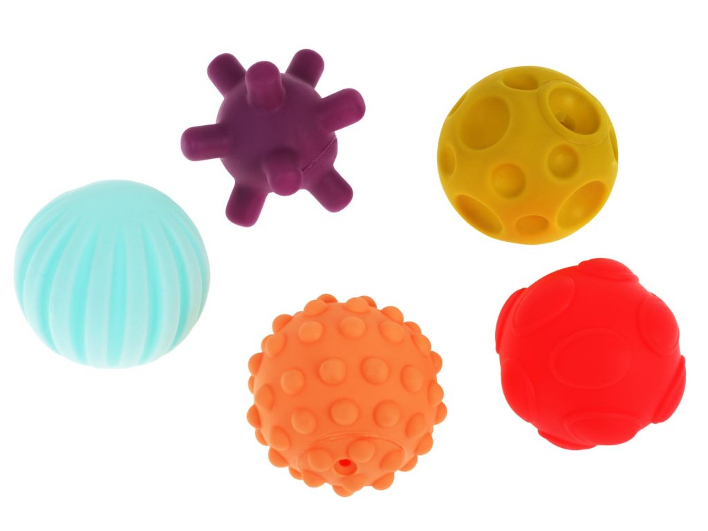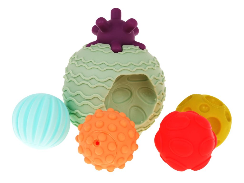 - large ball with recesses, - 4 smaller balls with different textures and shapes. |