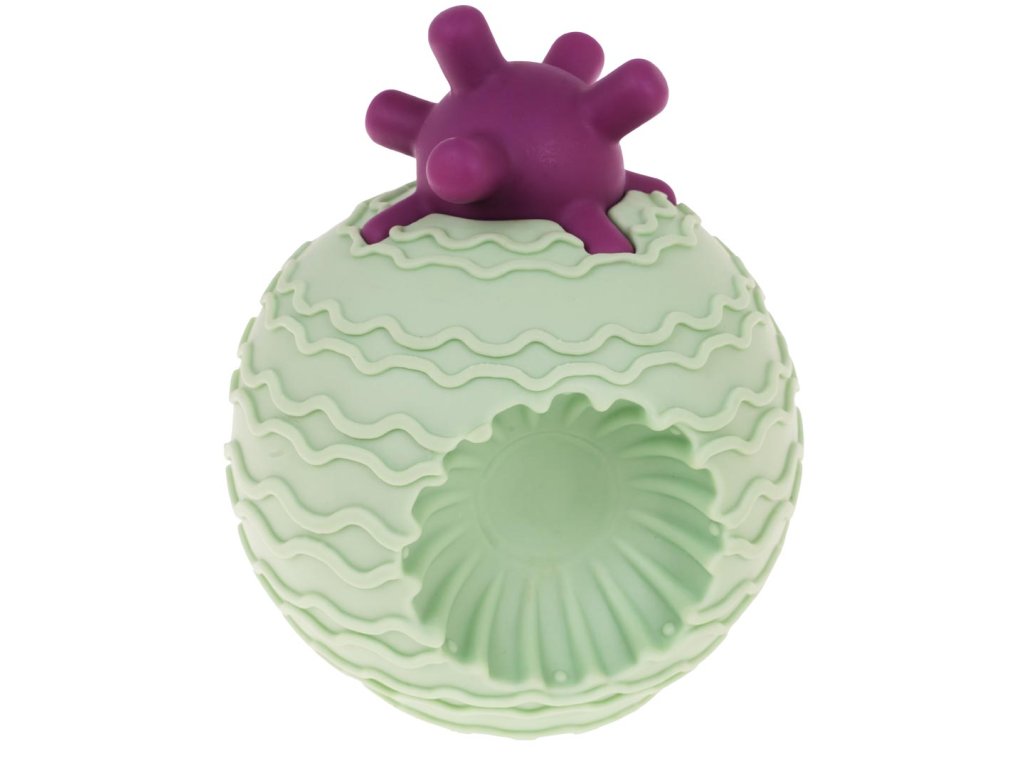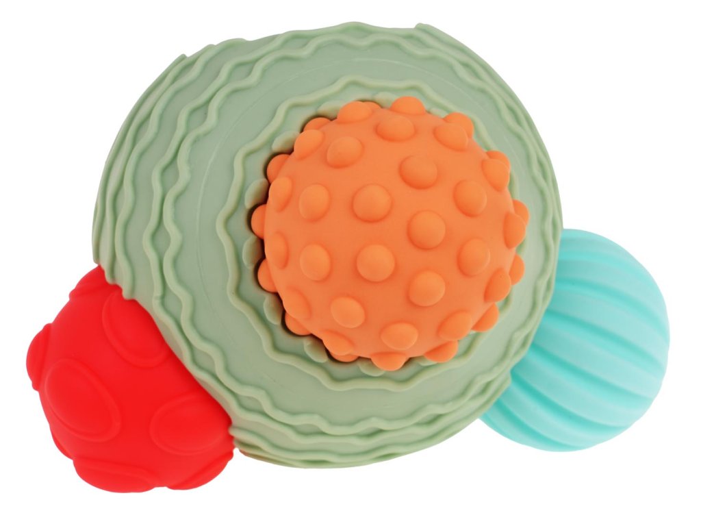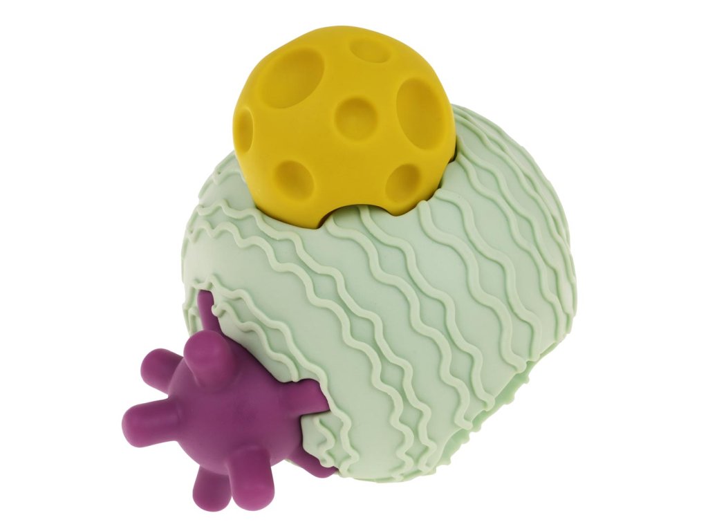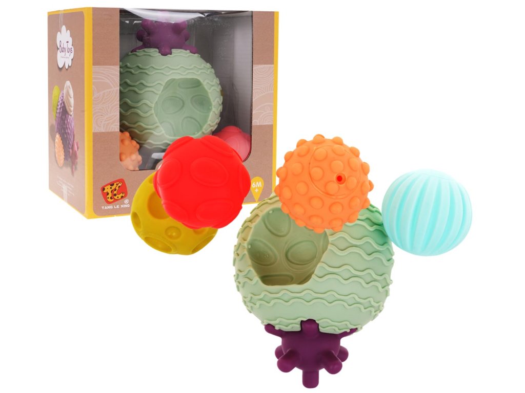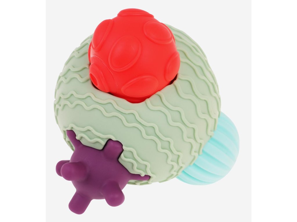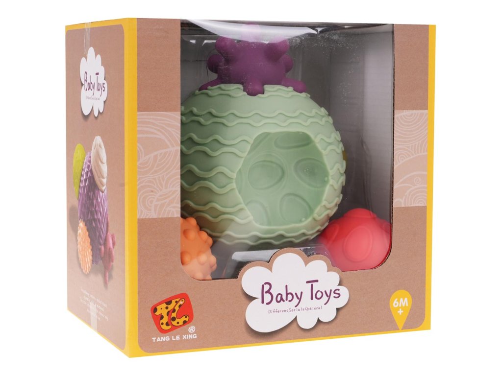 Sensory ball, for bathing for children from 6 months of age. The set consists of a large ball and 4 smaller ones with different textures and shapes. The large ball has recesses into which smaller balls should be fitted. The child learns to recognize colors and shapes. The toy will make bathing more attractive and train cognitive functions. The toy is made of the best quality materials safe for the child in vivid colors. Individual elements can also be used as teethers, helpful with teething.