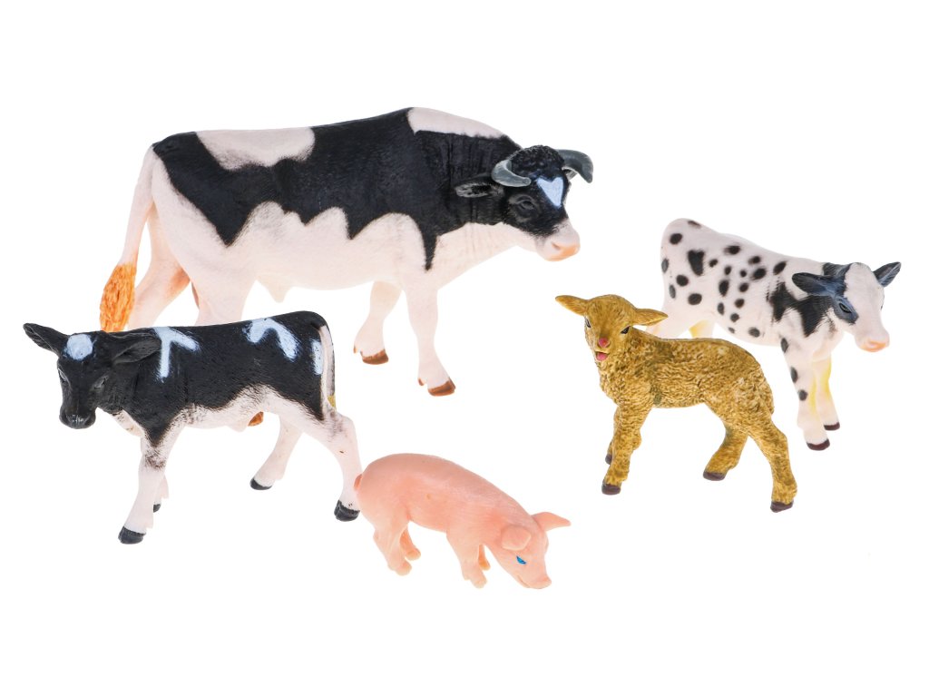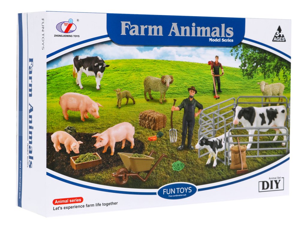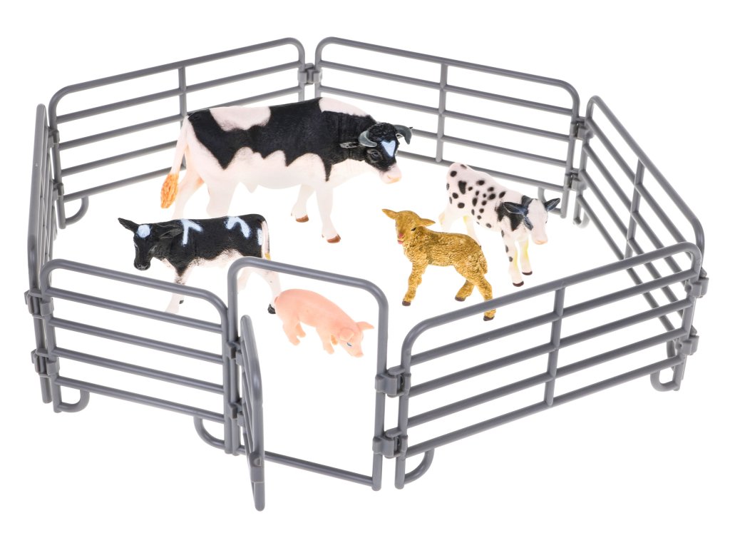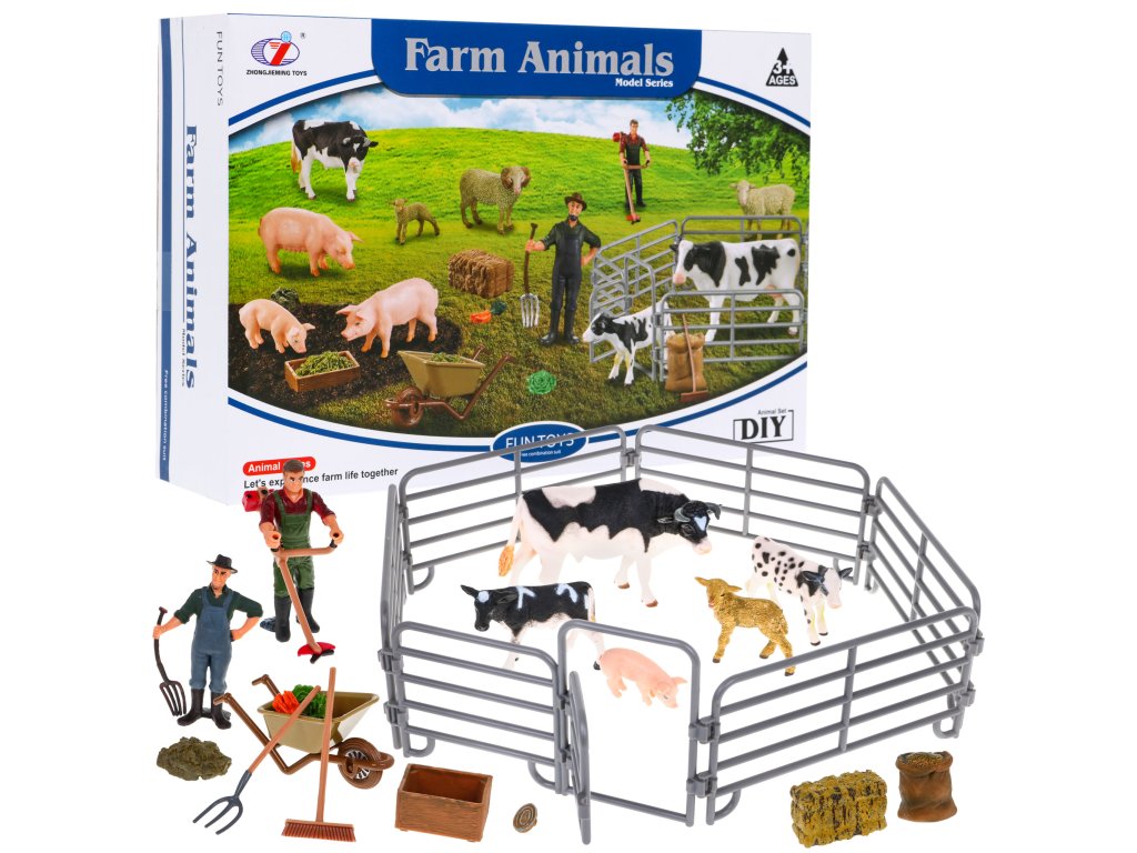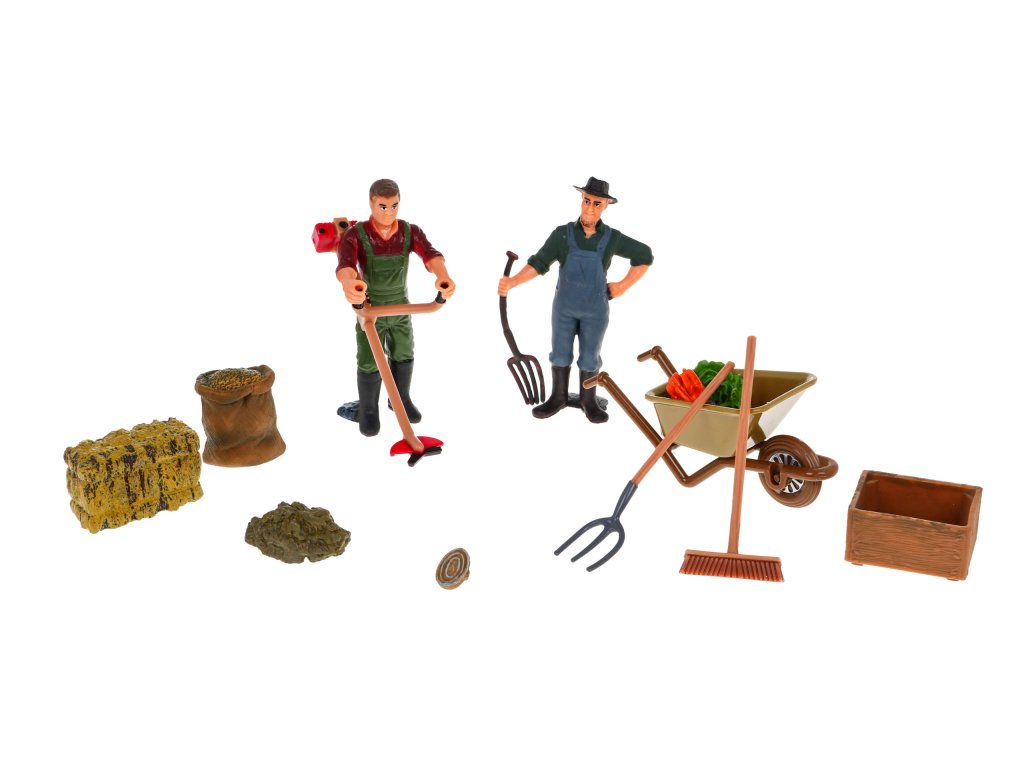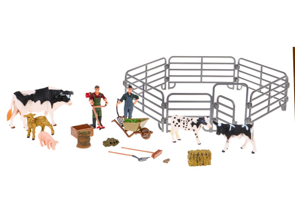 - cattle pen, - a cow with two calves, - piggy, - a sheep, - two farmer figures, - wheelbarrows, - vegetables (carrots, lettuce, beetroot), - brush for washing animals, - brush cutter, - rake, - broom, - feed for animals in a bag, - trough for animals, - straw in cubes |