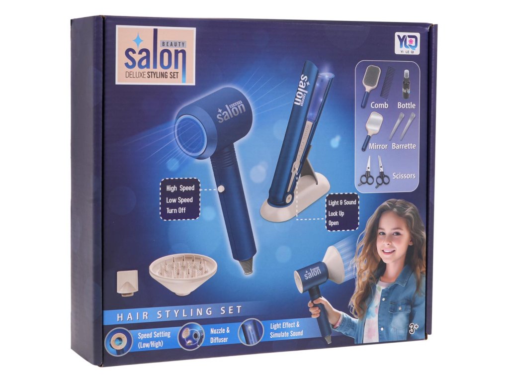 - suitable for children over 3 years of age, - made of the best quality materials, - dryer with replaceable attachments (diffuser and concentrating attachment), - the dryer emits a stream of air, - the dryer has a two-stage air flow regulation, - the dryer makes drying sounds, - the straightener has a slider for closing and opening, - the straightener has lighting, - the straightener makes noises typical of hair straightening, - practical stand for a hair dryer or straightener. |