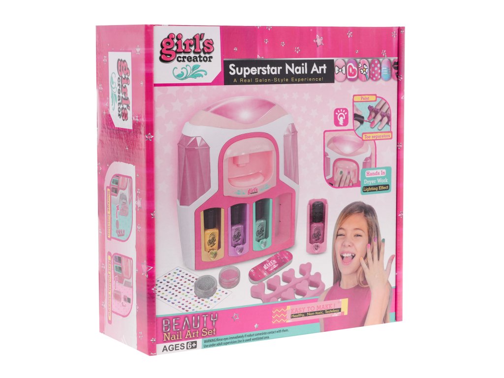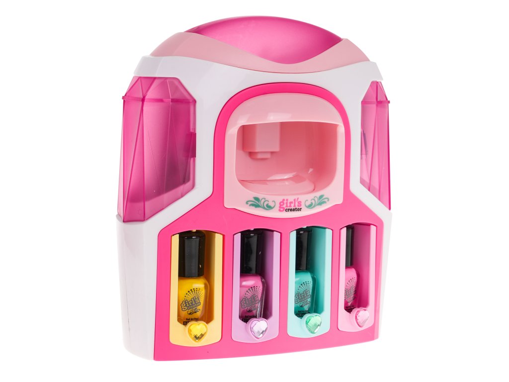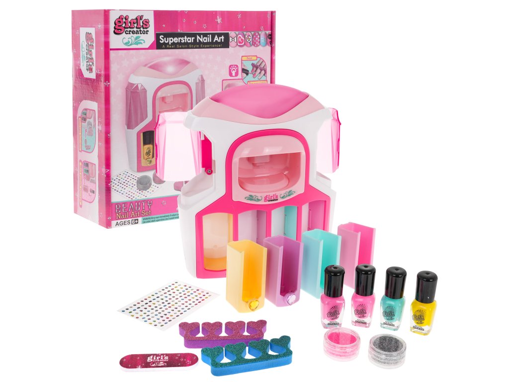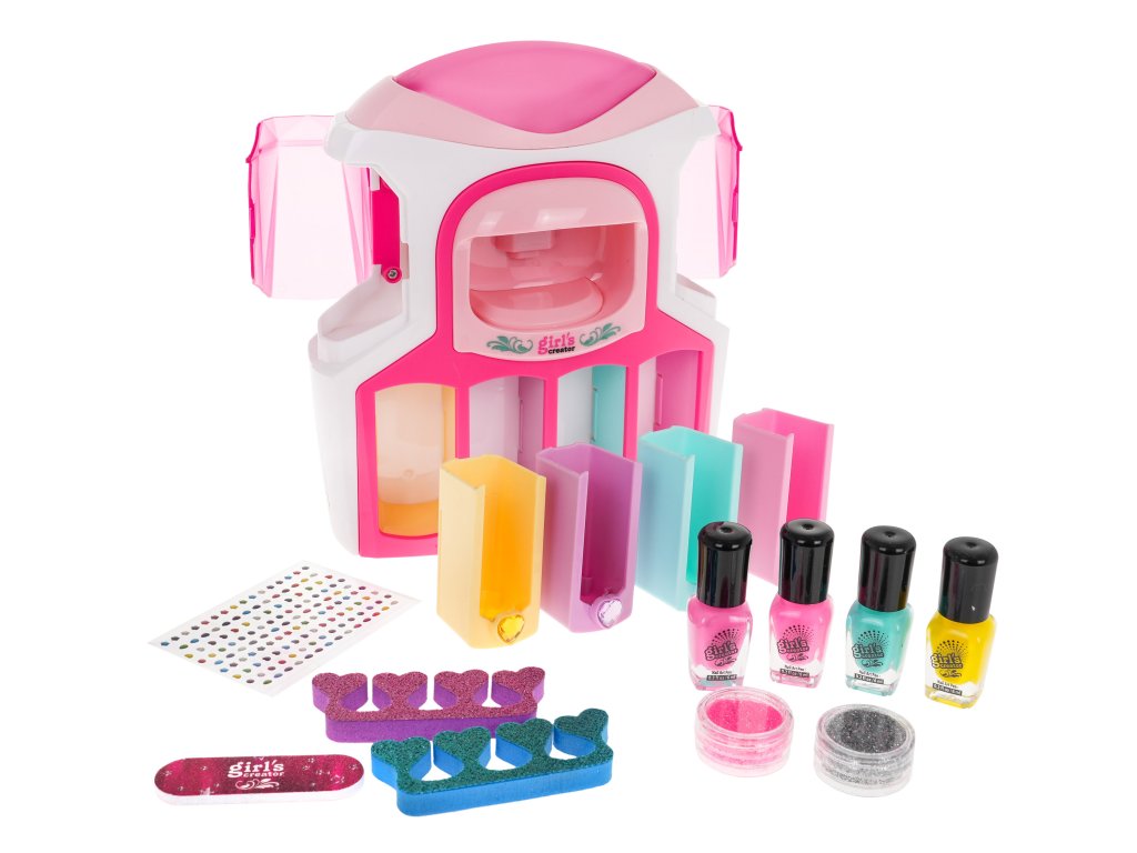 A nail painting set with an interactive nail dryer is for children from 6 years of age. The dryer is powered by 3 x AA 1.5V batteries, batteries are not included. When turned on, it makes a drying sound and has a gentle air flow. The light at the top of the dryer lights up while drying. The dryer has removable compartments at the front that hold nail polishes. Nail polishes are made of materials that are safe for children, are non-toxic and can be easily washed off with warm water. There are compartments for accessories on the sides of the dryer. |