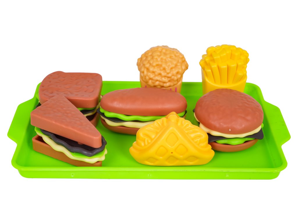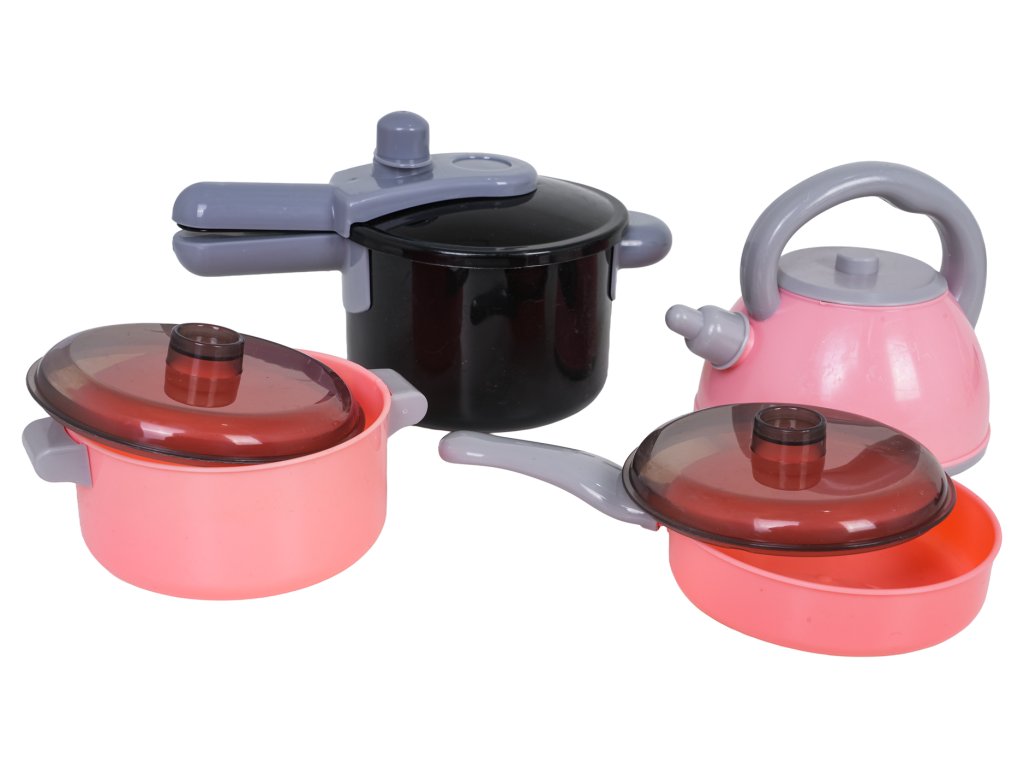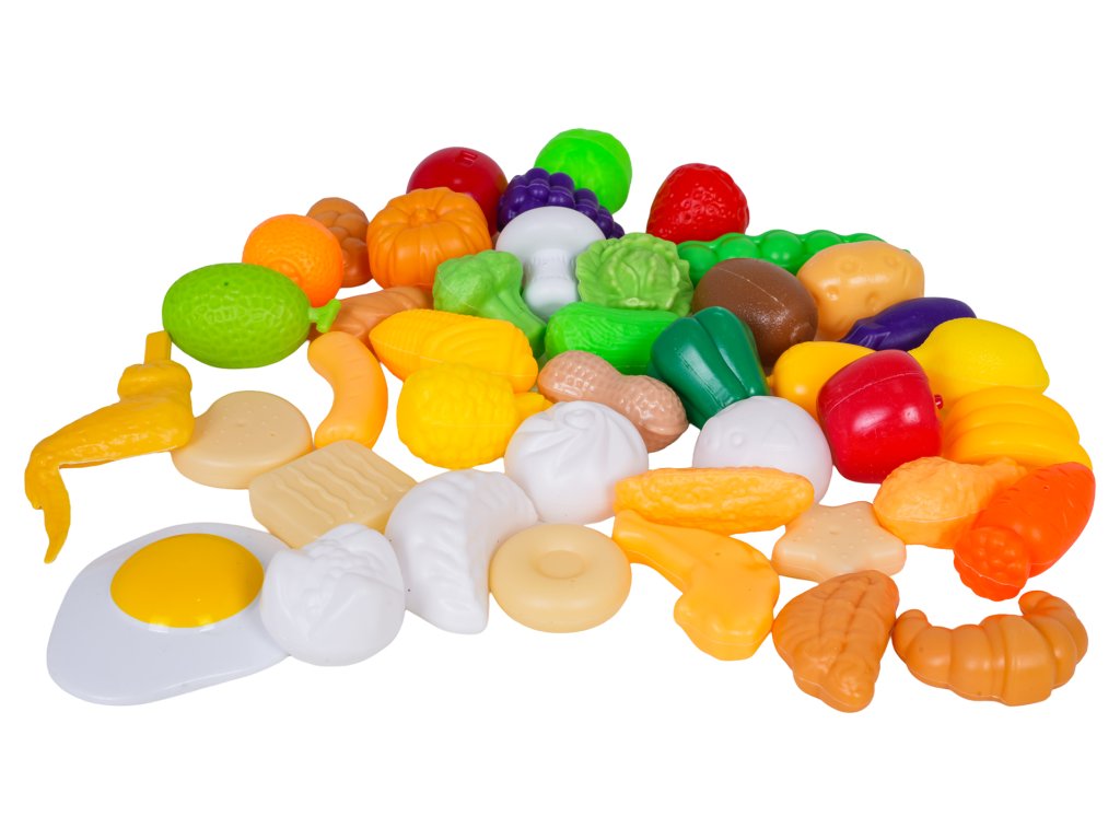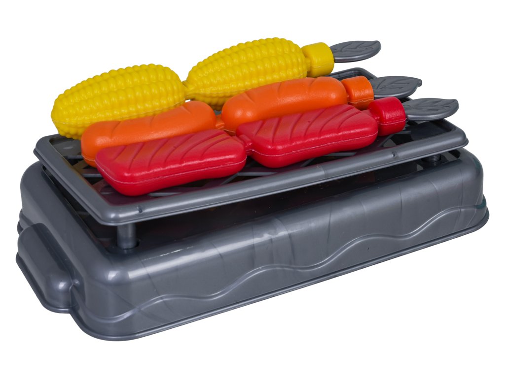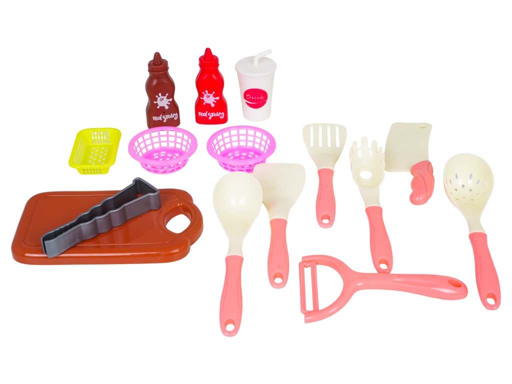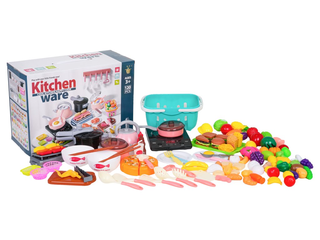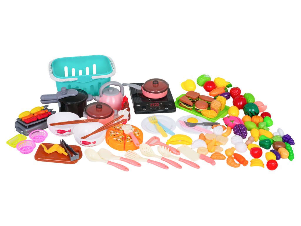 - induction cooker, - large shopping basket, - pot with lid, - frying pan with lid, - pressure cooker, - kettle - barbecue, - chopping board, - tray, - 2 x bowls, - 3 x small basket, - pliers, - pasta spoon, - a ladle, - 2 x spatula, - pizza wheel, - peeler, - cleaver, - 4 x sticks, - 2 x forks, - 2 x knife, - 2 x plates, - mock food products: drink in a cup, pizza on turnips, sandwich, fried egg, popcorn, fries, ketchup, sauce, hot dog, hamburger, toast, pineapple on turnips, strawberry on turnips, lettuce on turnips, peach on turnips, lemon on turnips, tomato on turnips, watermelon on turnips, red pepper on turnips, grape on turnips, carrot on turnips, banana on turnips, 3 x kebab on a stick, eggplant on turnips, 2 x meringue, 2 x dumplings, pumpkin, eggplant, grapes, green peas, broccoli, corn, potato, 3 x lettuce, tomato, red and green peppers, kiwi, mushroom, strawberry, orange, pineapple, carrot, bananas, hazelnut, lemon, chicken leg, chicken wing, cutlet, 3 x cookies, bread, challah, croissant. |