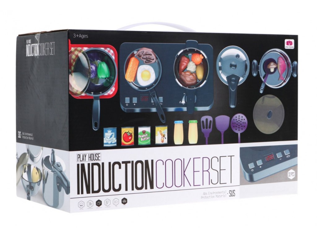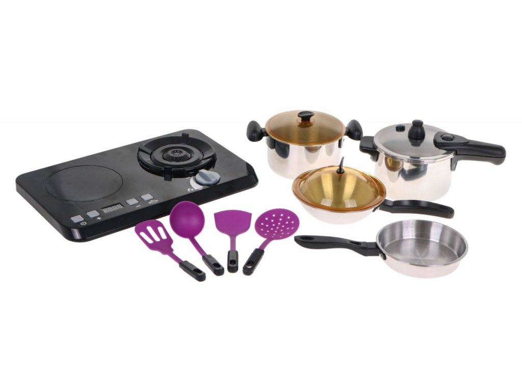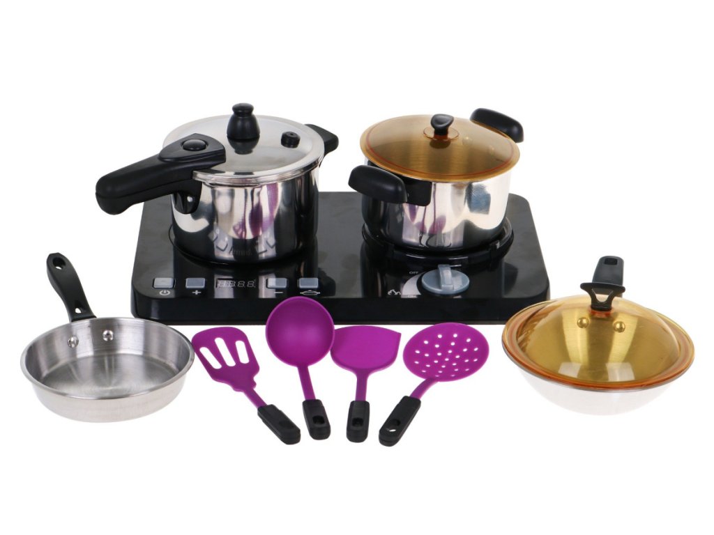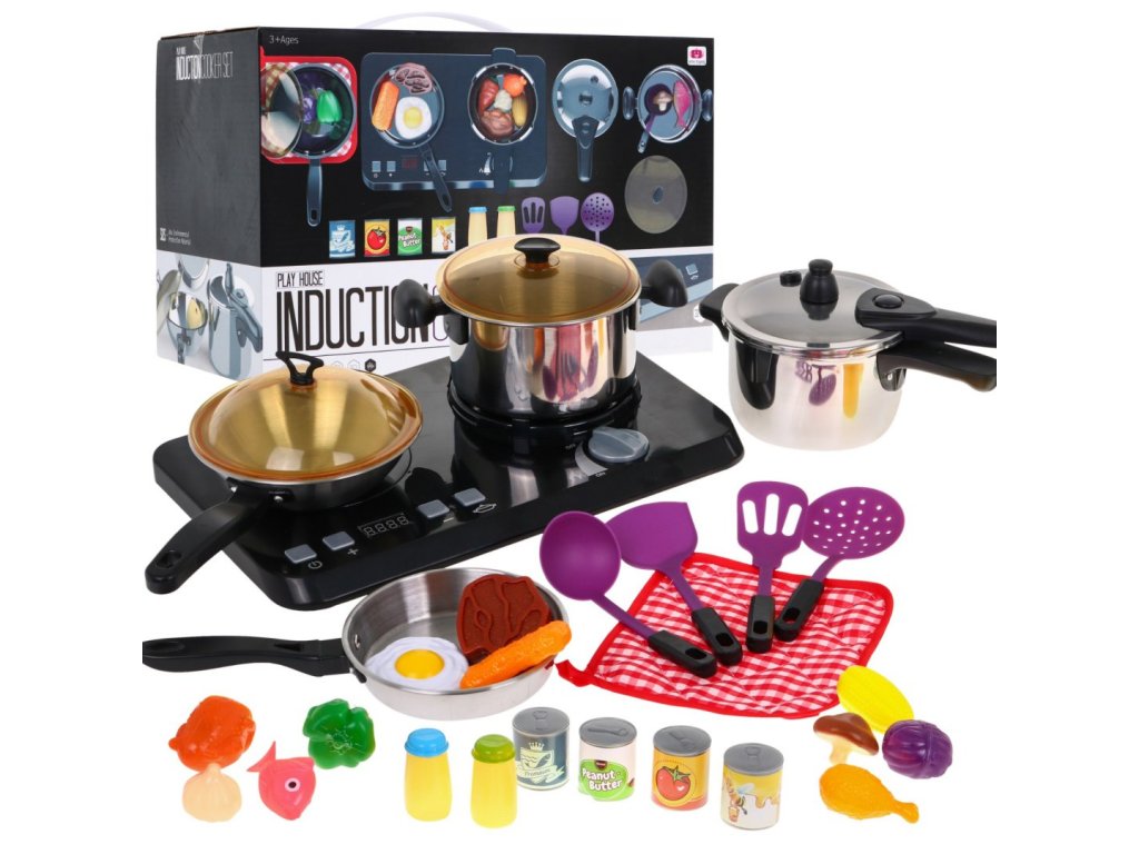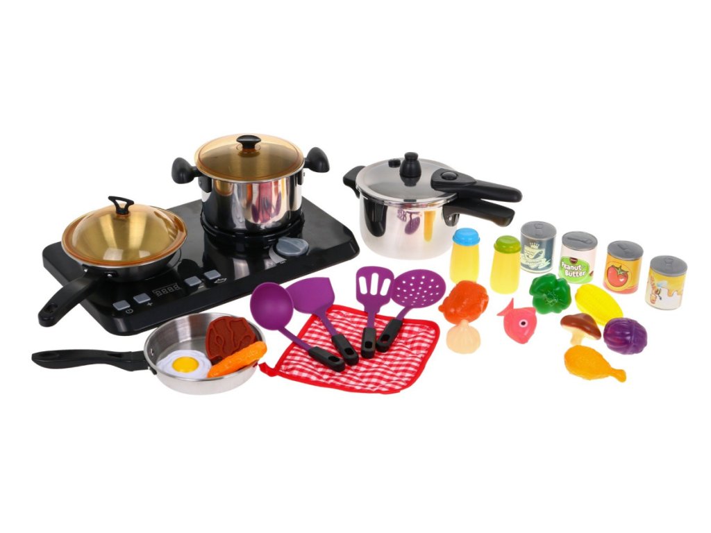 An amazing, well-equipped kitchen set consisting of an induction hob, pots and cooking accessories, is a proposal for children from three years of age.The frying pan, pot and pressure cooker are deceptively real, but in a miniature version.The induction hob is powered by 3 x AA 1.5V batteries (not included), it has sound and light effects.On the left side there is an illuminated burner with cooking sounds and a panel for changing the cooking time from 2 to 20 minutes.On the right side there is an illuminated burner with frying sounds and the ON / OFF knob.The set also includes dummy food products. | |
