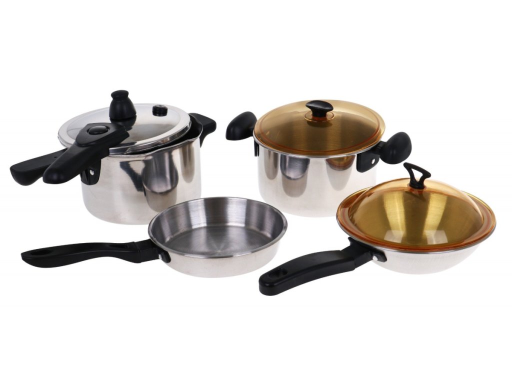- pressure cooker approx. 23 cm x 10 cm x 13 cm, - wok with lid, approx. 24 cm x 15 cm x 7 cm, - frying pan approx. 24 cm x 13 cm x 3 cm, - a pot with a lid, approx. 12 cm x 19 cm x 15 cm, - cans: honey, sardines, sauce, peanut butter, approx. 5 cm x 5 cm, - spatula, ladle, strainer approx. 16 cm x 6 cm, - other accessories approx. 7 cm x 4 cm, - package approx. 34 cm x 21 cm x 18 cm. |