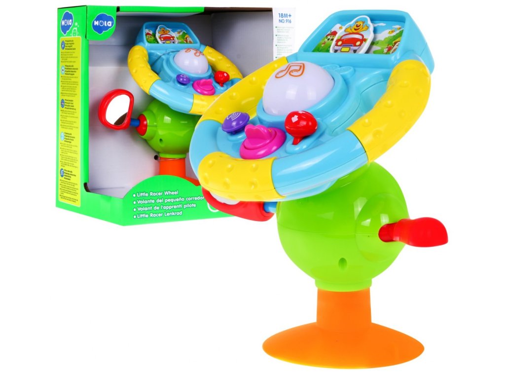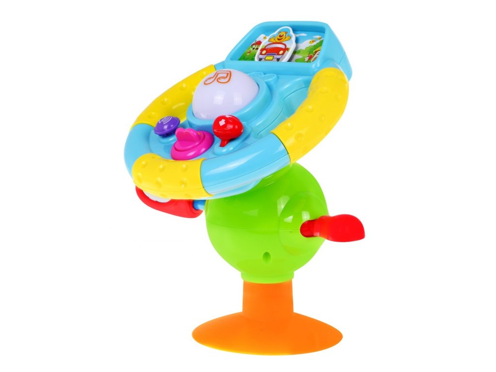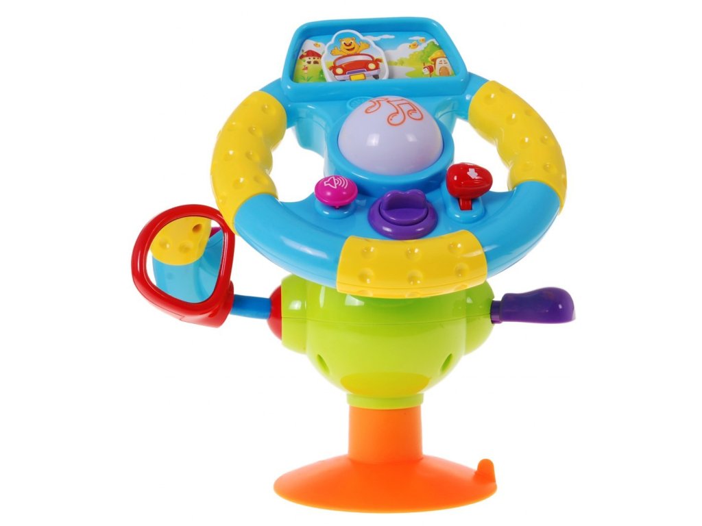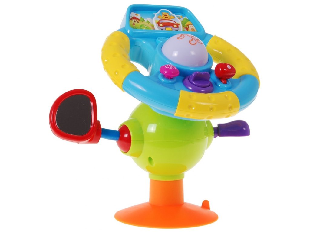 | The steering wheel can be held in the handles, rested firmly on the support set between the legs, or with a suction cup attached to a level surface. The various buttons on the steering wheel activate the following functions: - the key starts the car engine, - lever on the right side - speed change - 2-step scale, change of car speed. - horn on the left side of the steering wheel, - button with musical notes activates melodies that accompany the game, - adjustable, safe side mirror, - direction indicator. The toy is additionally equipped with a suction cup. The steering wheel is equipped with a screen, on which the picture is shown, on which the travel route is indicated. In addition, the sounds are colored by the steering wheel buttons. The ergonomic shape of the steering wheel fits perfectly with children's hands. |