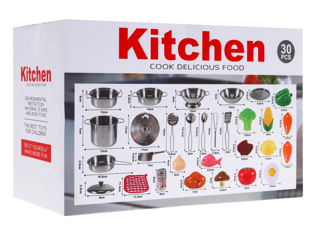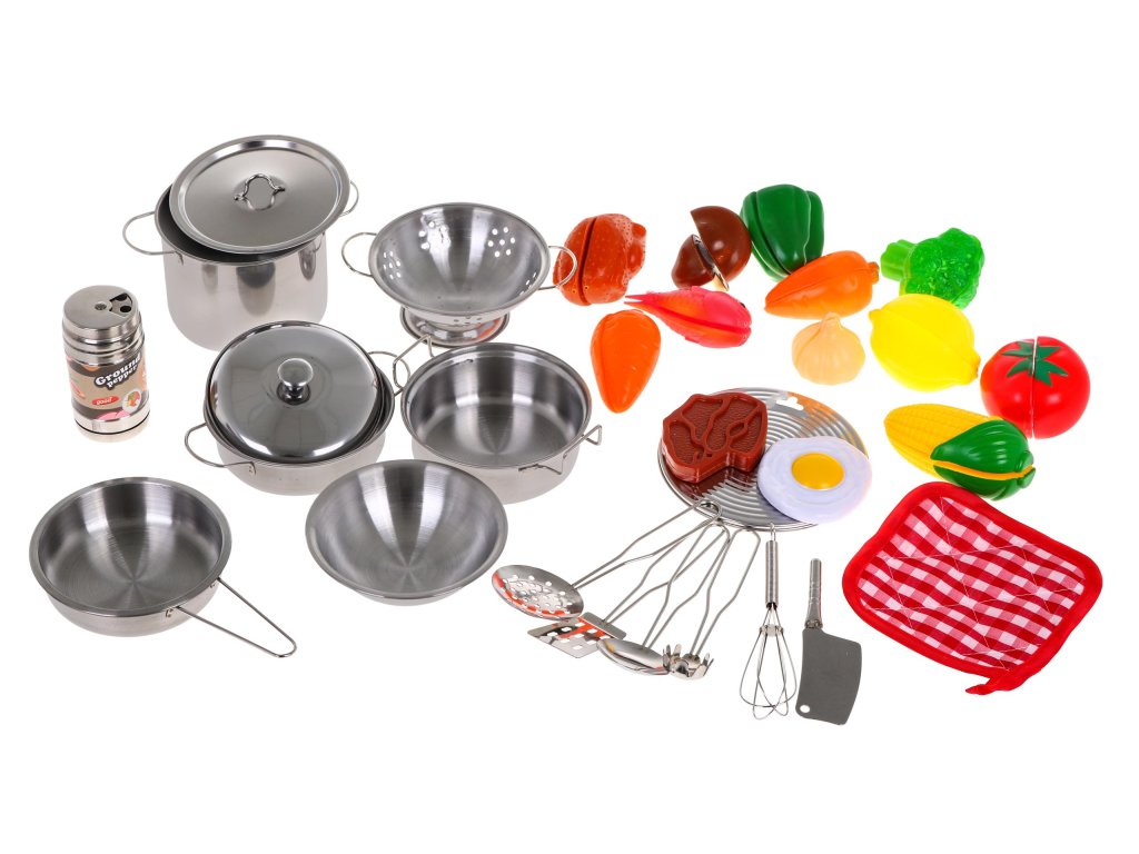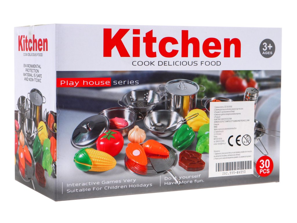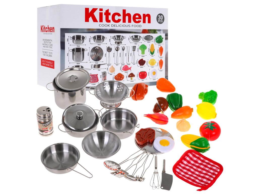 | A 30-piece kitchen set intended for children over 3 years of age. Cooking accessories made of metal and food imitations made of plastic Children love to observe their surroundings, which is why they often play in a shop, house or kitchen. Then they play various roles, playing different characters. The presented kitchen set can be a perfect way to diversify such fun. |