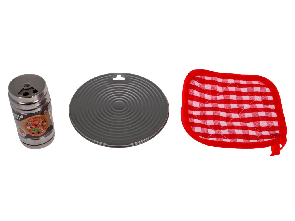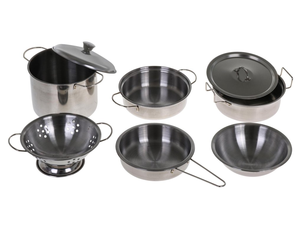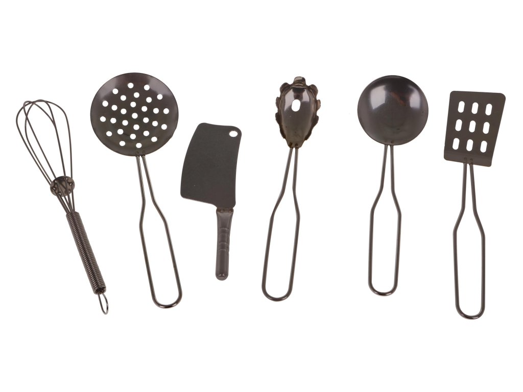| - metal pot approx. 13 x 13 x 4 cm, - metal pot approx. 14x14x2.5cm, - metal colander approx. 14 x 14 x 4 cm, - metal bowl approx. 10x10x3cm, - metal lid approx. 9.8x9.8.2.5cm, - metal pot approx. 13x13x7cm, - metal stand approx. 11x11cm, - metal pan approx.16.5x10x2.5cm, - metal lid approx. 9 x 9 x 2.5 cm, - metal slotted spoon approx. 14 x 4.8 cm, - metal ladle approx. 13.1 x 4 cm, - metal pasta spoon approx. 12.8 x 2.5 cm, - metal whisk approx. 14x2.5cm, - metal spatula approx. 14 x 3 cm, - metal cleaver approx. 7 x 4.5 cm, - metal pepper shaker (with three types of holes) about 8x4x4cm, - material support approx. 11.3 x 11.3 cm, - plastic pepper approx. 6.5 x 4.9 cm, - plastic broccoli approx. 6.2 x 5.9 cm, - plastic corn about 8.5x5cm, - 2x plastic carrots approx. 6.8x3.5cm, - a plastic lemon, approx. 7.2 x 5.2 cm, - plastic steak approx. 6.8 x 5.5 cm, - a plastic fried egg about 6.4 x 5.8 cm, - plastic tomato approx. 6x4.5cm, - plastic fish approx. 8.2 x 4.2 cm, - plastic mushroom approx. 4x4.5 cm, - plastic garlic about 4 x 4 cm, - plastic rotisserie chicken 7x4.5cm. |