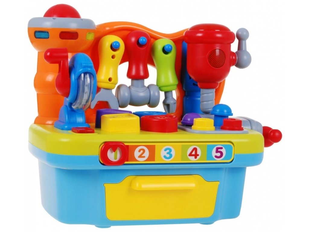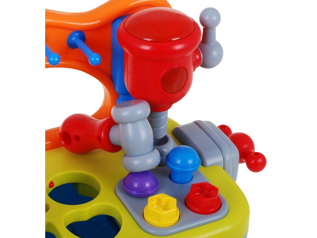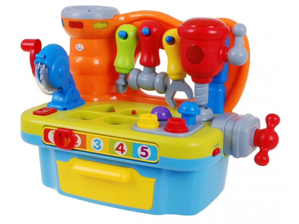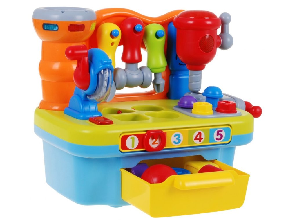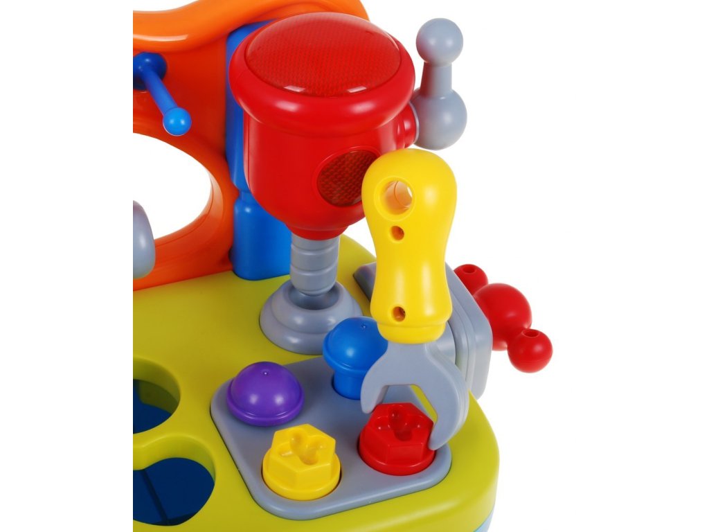 | The DIY workshop is equipped with a variety of functions. We find here a rotating circular saw, drill. Each of the tools is equipped with a practical handle, which you can use to start each tool. In addition, a vice was mounted on the side wall, which will allow our little one to learn how to screw on and off, which will be accompanied by the sounds of rattling. In addition, the workshop includes nails for driving in and screws for screwing. Additional equipment is tools: a screwdriver, a wrench and a hammer, all in proportions perfectly suited to small children's hands. The workshop is also a great place to practice shape recognition skills and matching them. The workshop top is equipped with a sorter that perfectly develops the child's skills. If the toddler adjusts the shape of the block to the shape cut out in the countertop, he will be rewarded with what shape he has chosen. As an additional element diversifying the fun - we can play hitting the target. Let's slide the ball into the cylinder next to the tools, if we push the ball deeper, we will hear a cheerful melody as a reward. All the elements that will match the appropriate holes can be found in the practical toy drawer. At the front of our workshop there is a mysterious zipper, if we move it we will learn to count to 5. An additional advantage of the toy is the ability to adjust the volume. Happy fun is accompanied by blinking lights. The toy has an English language version. This multifunctional educational toy simultaneously develops the child's imagination, dexterity and motor coordination. Through play, the toddler learns logical thinking, recognizing shapes and colors, using objects and matching them from each other. |