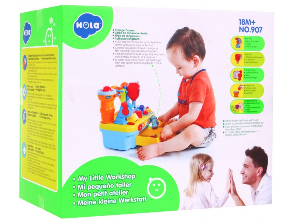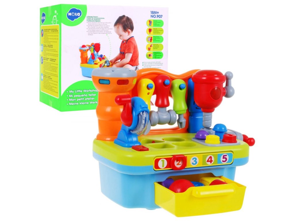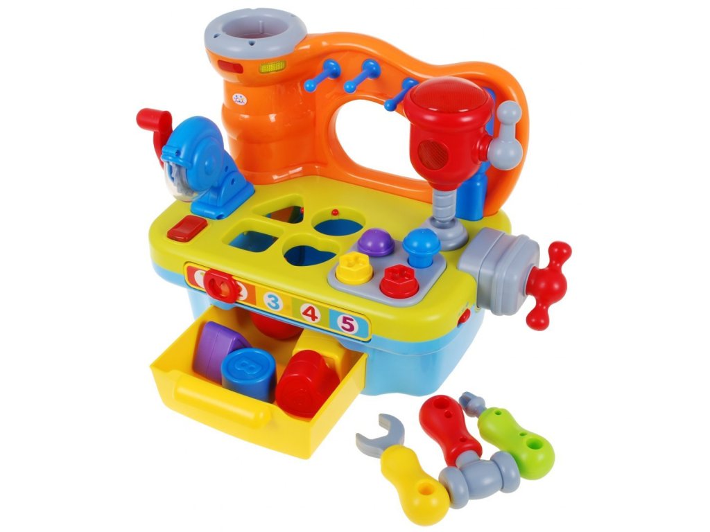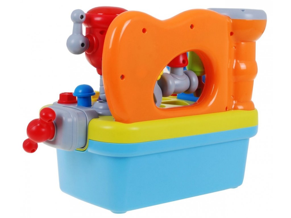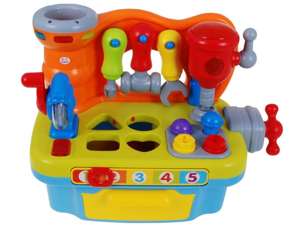 | The DIY workshop is equipped with a variety of functions. We find here a rotating circular saw, drill. Each of the tools is equipped with a practical handle, which you can use to start each tool. In addition, a vice was mounted on the side wall, which will allow our little one to learn how to screw on and off, which will be accompanied by the sounds of rattling. In addition, the workshop includes nails for driving in and screws for screwing. Additional equipment is tools: a screwdriver, a wrench and a hammer, all in proportions perfectly suited to small children's hands. The workshop is also a great place to practice shape recognition skills and matching them. The workshop top is equipped with a sorter that perfectly develops the child's skills. If the toddler adjusts the shape of the block to the shape cut out in the countertop, he will be rewarded with what shape he has chosen. As an additional element diversifying the fun - we can play hitting the target. Let's slide the ball into the cylinder next to the tools, if we push the ball deeper, we will hear a cheerful melody as a reward. All the elements that will match the appropriate holes can be found in the practical toy drawer. At the front of our workshop there is a mysterious zipper, if we move it we will learn to count to 5. An additional advantage of the toy is the ability to adjust the volume. Happy fun is accompanied by blinking lights. The toy has an English language version. This multifunctional educational toy simultaneously develops the child's imagination, dexterity and motor coordination. Through play, the toddler learns logical thinking, recognizing shapes and colors, using objects and matching them from each other. |