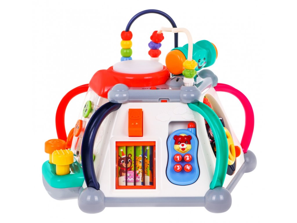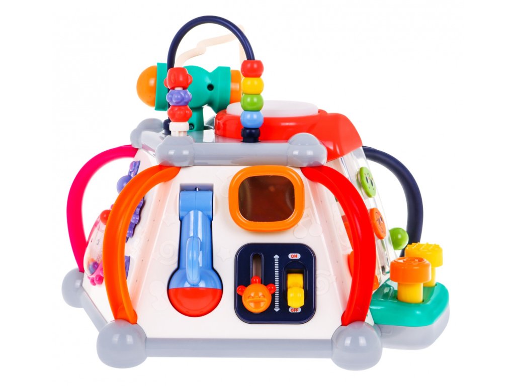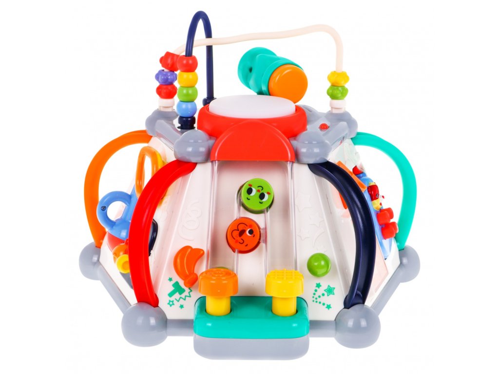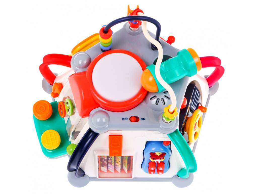 Sixth wall | - on / off switch for the whole box, - a hammer with rubberized ends and a place for its storage, - a glowing-playing drum, - two labyrinths with colorful beads to move. |