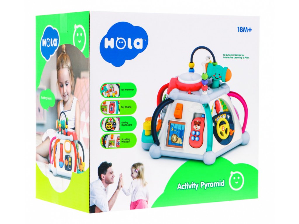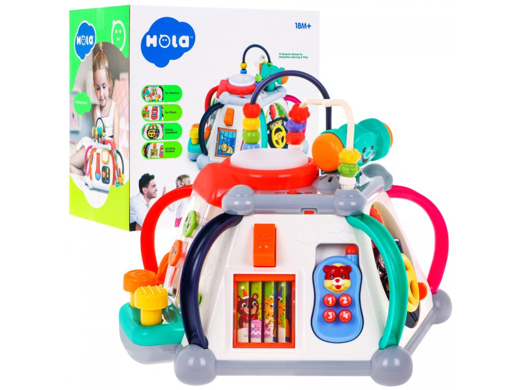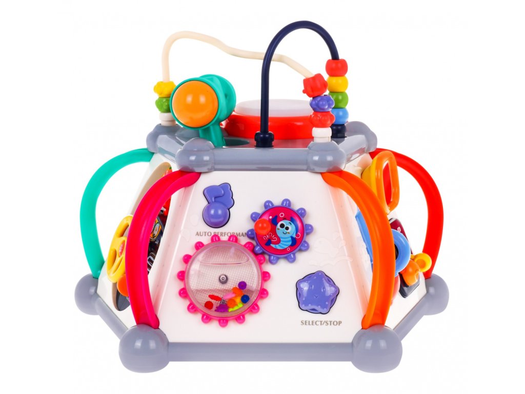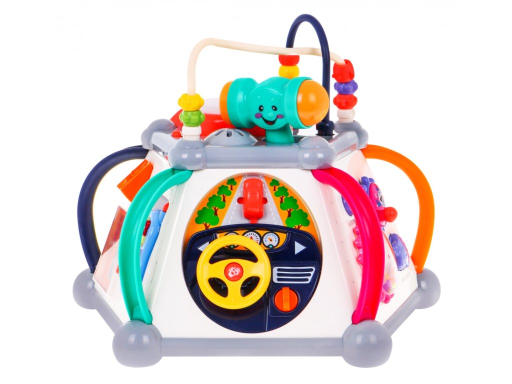 Sixth wall | - on / off switch for the whole box, - a hammer with rubberized ends and a place for its storage, - a glowing-playing drum, - two labyrinths with colorful beads to move. |