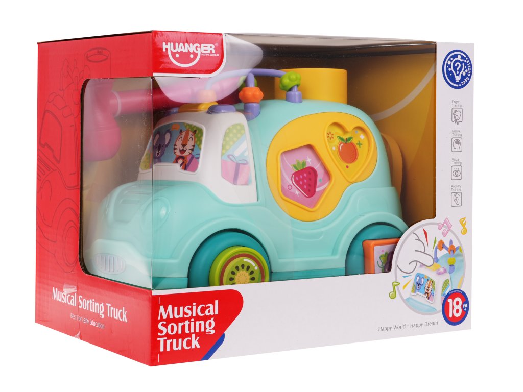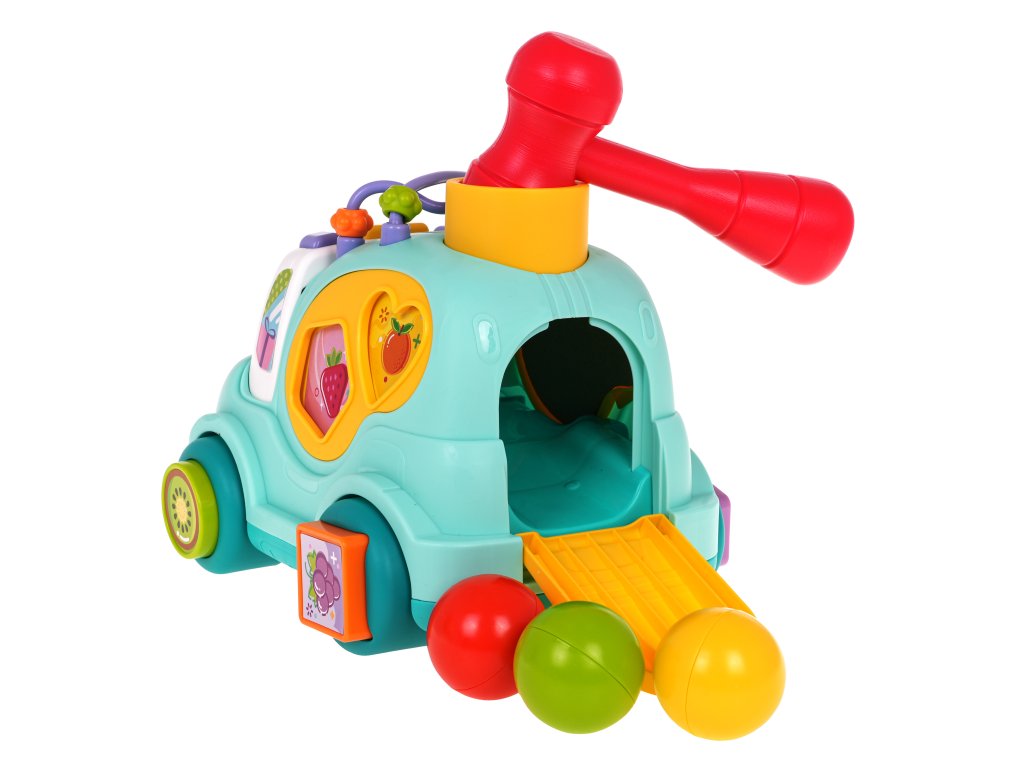 - suitable for children over 18 months of age, - made of the best quality materials in vivid colors, - sound functions: melodies, vehicle starting sounds, horns, - lighting effects in the form of flashing lights, - shape sorter on the sides of the vehicle and on the wheels, - layered with beads, - inlet for inserting balls, - balls with rattles, hammer and blocks included, - opening vehicle doors. |